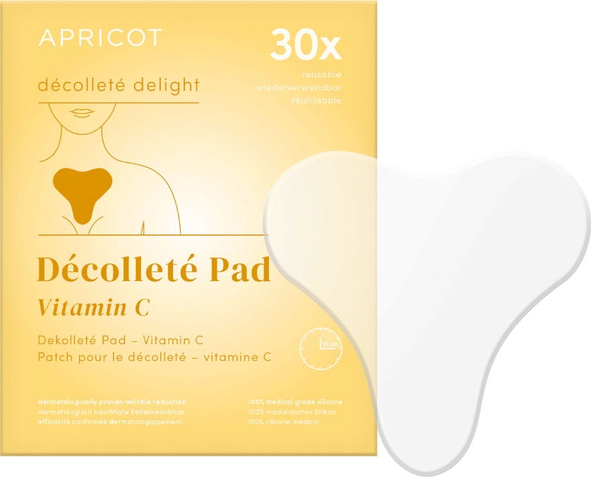 Mit dem Vitamin C Dekolleté-Pad von APRICOT pflegst du hyperpigmentierte oder sonnengeschädigte Haut im Dekolletébereich intensiv. Das Pad besteht aus medizinischem Silikon und ist mit antioxidativem Vitamin C angereichert, wodurch Linien und Fältchen geglättet werden können. Es kann bis zu 30x wiederverwendet werden.