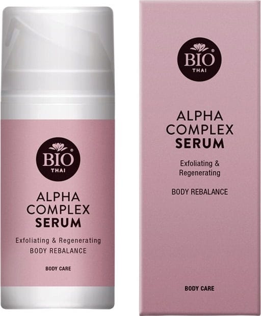 Das Alpha Complex Serum von Bio Thai besteht aus einer Mischung aus fruchtigen Alphahydroxy-Säuren (AHAs), verstärkt durch wertvolle Phytokomplexe. Dieser Aktivstoff-Mix ermöglicht eine schnelle, aber sanfte Ablösung von Hautschüppchen sowie eine rasche Restrukturierungs-, Regenerations- und Verdichtungsaktivität der Haut. Dank stabilisiertem Vitamin C und antioxidativen Pflanzenextrakten wird die Haut auch sichtbar aufgehellt und vor Umweltstress bewahrt. Freue dich auf ein glattes, einheitliches und strahlendes Hautbild auf dem Körper!