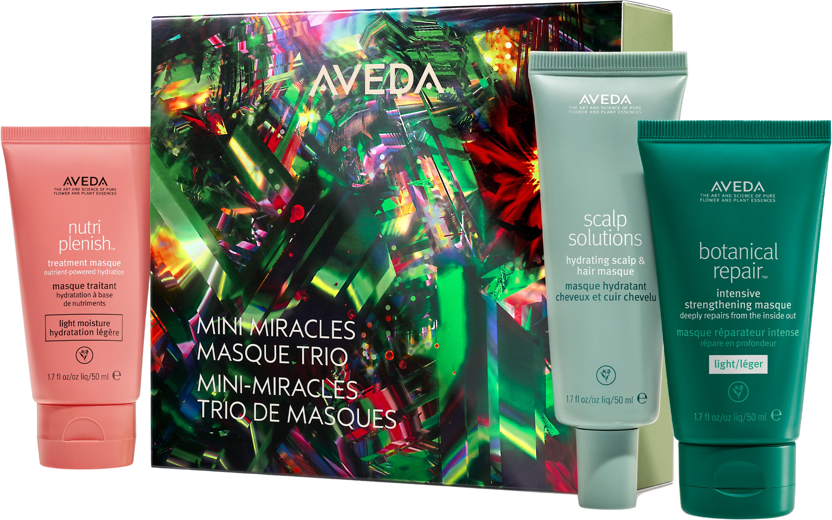 Le coffret en édition limitée Mini Miracles Masque Trio de Aveda réunit trois masques capillaires intensifs en format pratique. Présenté dans une boîte-cadeau réutilisable inspirée des teintes des aurores boréales, ce trio est parfait pour offrir ou s’offrir une routine de soin complète pour les cheveux et le cuir chevelu.
