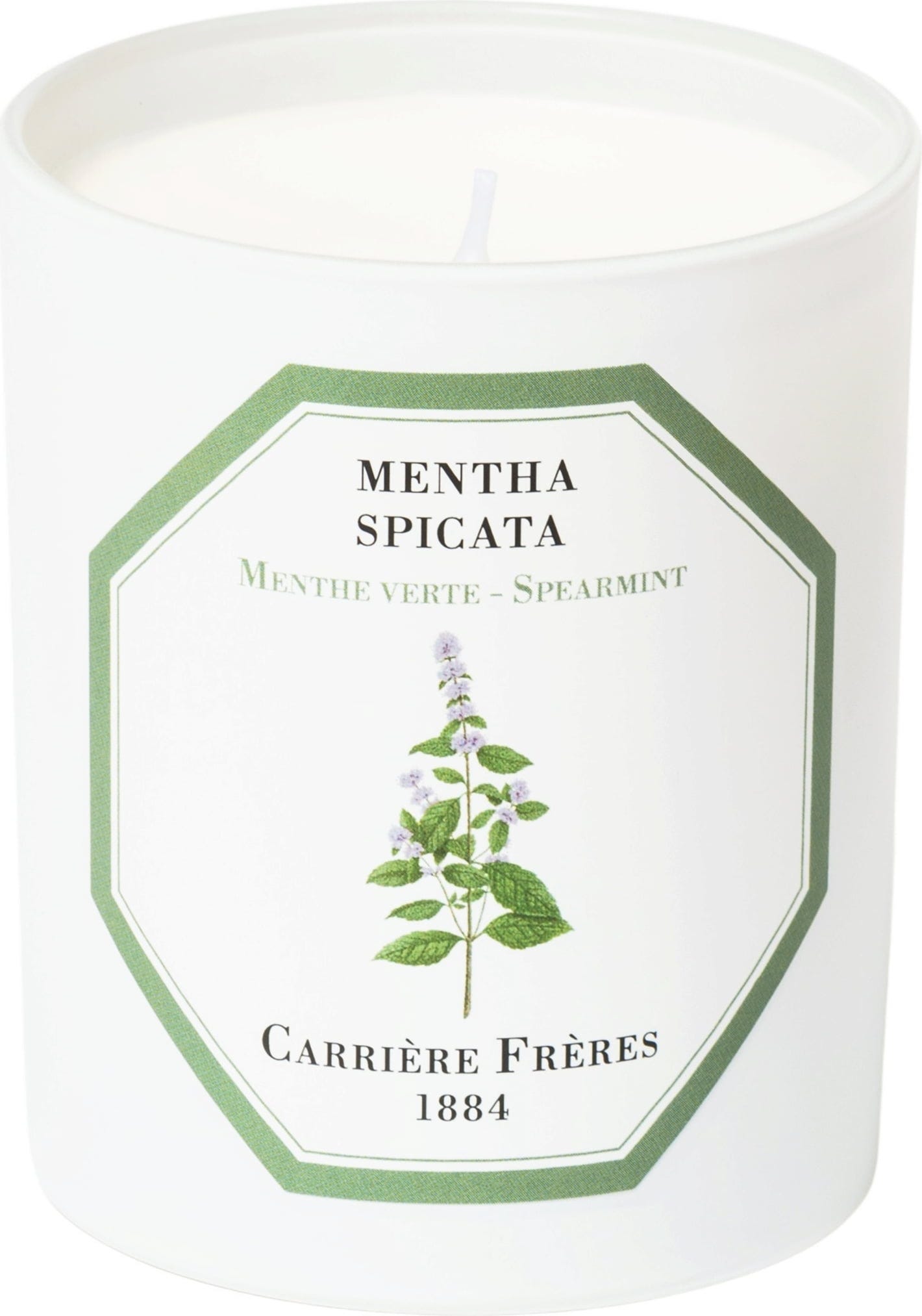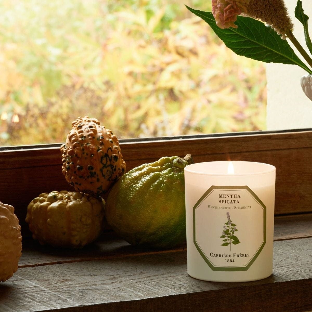 De Geurkaars Spearmint van Carrière Frères heeft een kruidige geur die licht pittig, fris en groen aandoet. Het subtiele maar bedwelmende aroma begeleidt je graag op lentedagen en zwoele zomeravonden. Bovendien staat spearmint bekend om zijn verkwikkende eigenschappen en ondersteunt het je in stressvolle situaties.