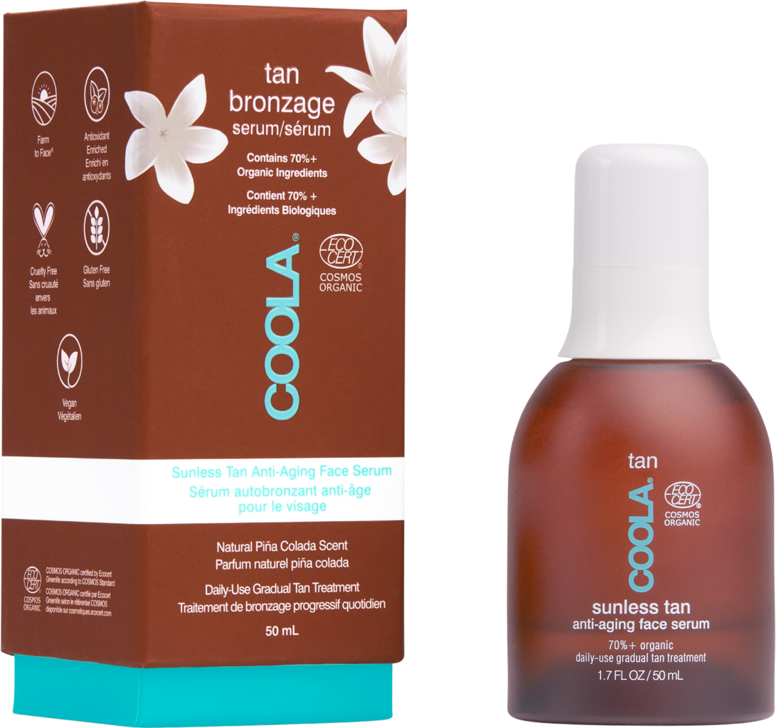Het Sunless Tan Anti-Aging Face Serum van COOLA geeft je het hele jaar door een natuurlijke, streeploze en gelijkmatige bruine teint die tot drie dagen aanhoudt. Het mengsel van arganolie, vitamine C, hyaluronzuur en plantaardige stamcelculturen zorgt daarbij ook voor een gladde, goed gehydrateerde en stralende huid. Het serum is uitstekend geschikt voor op zichzelf of als aanvulling op de dagelijkse vochtinbrengende verzorging.