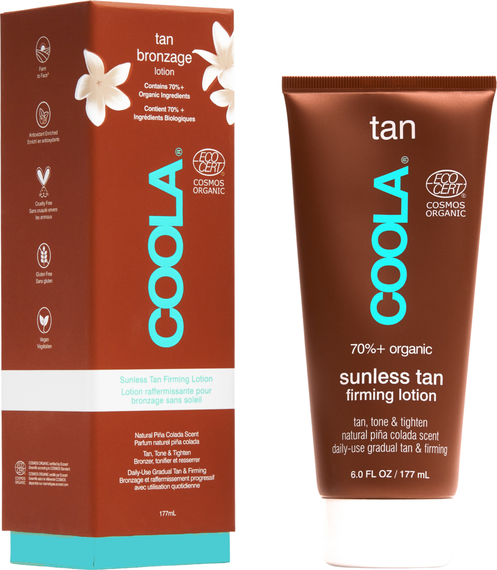 De Sunless Tan Firming Lotion van COOLA geeft het lichaam een natuurlijke, gouden glans en verzorgt de huid tegelijkertijd. De zelfbruinende lotion heeft een natuurlijke Piña Colada-geur en zorgt voor een streeploze, subtiele bruining die meerdere dagen aanhoudt. De formule, die voor 99% uit natuurlijke ingrediënten bestaat en Ecocert®-gecertificeerd is, bevat hydraterende sheaboter en cafeïne, die de huid ook steviger en gladder maken.