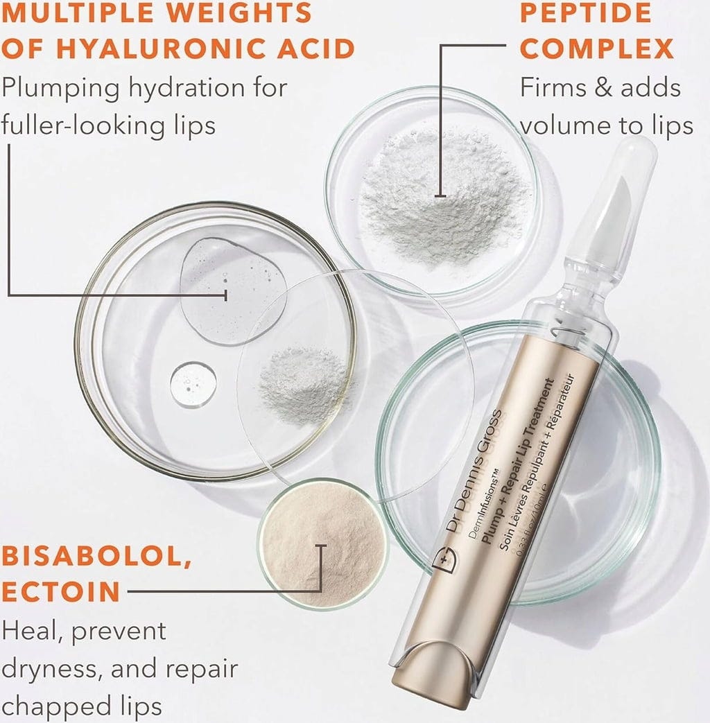 Met de DermInfusions™ Plump + Repair behandeling van Dr. Dennis Gross Skincare krijg je op natuurlijke wijze vollere en stevigere lippen. De heldere, niet-plakkerige lipgloss is verrijkt met hyaluronzuur met vier verschillende moleculaire gewichten en een volumineus peptidecomplex dat in de huid doordringt en deze van binnenuit verzorgt. De unieke formule met bisabolol, ectoine, centella asiatica en trehalose hydrateert, vult de lippen op en verzorgt ze.