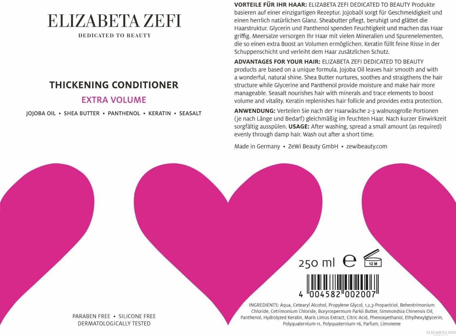 De Thickening Conditioner van Elzabeta Zefi bevat een verzorgende combinatie van jojobaolie, sheaboter, panthenol en glycerine, die het haar voedt, voor soepelheid en een gezonde glans zorgt. Keratine vult kleine scheurtjes in de haarstructuur en vormt een beschermende laag om elk haar. Mineralen en sporenelementen uit zeezout geven meer volume en grip.