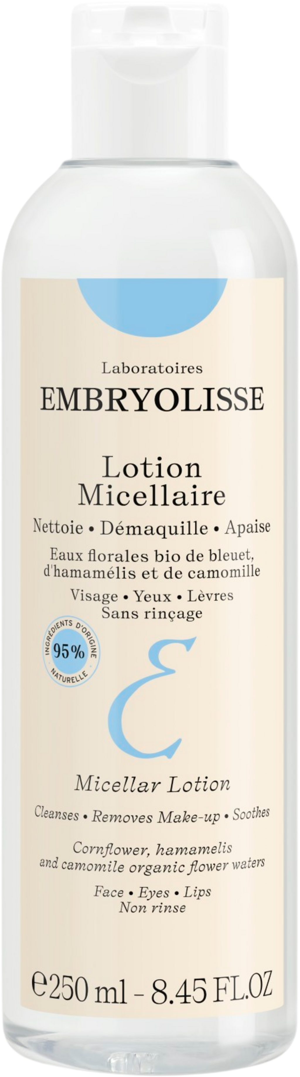 De Micellaire Lotion van Embryolisse is een zachte en effectieve reinigingslotion om make-up 's avonds te verwijderen, maar het verwijdert ook de onzuiverheden die gedurende de nacht zijn verzameld in de ochtend. De formule lost zelfs langdurige foundation en waterproof mascara op, zonder de huid te irriteren. De lotion bevat natuurlijke bloemenwater (korernbloem, hamamelis en kamille) en een vleugje glycerine en reinigt de huid bijzonder zacht, zodat deze fris, glad en verzorgd aanvoelt.