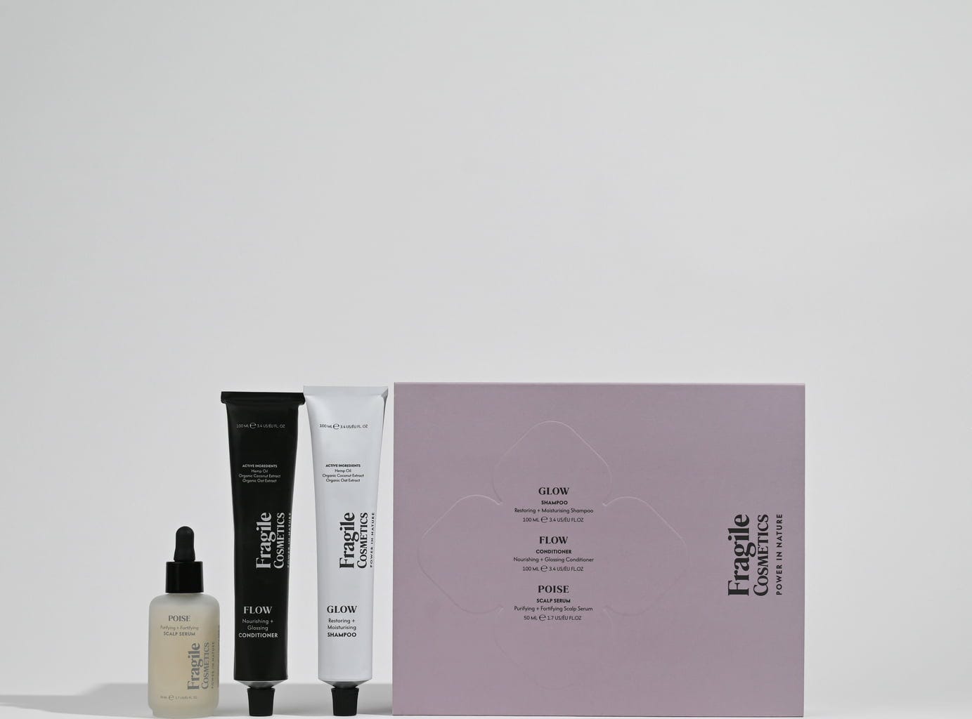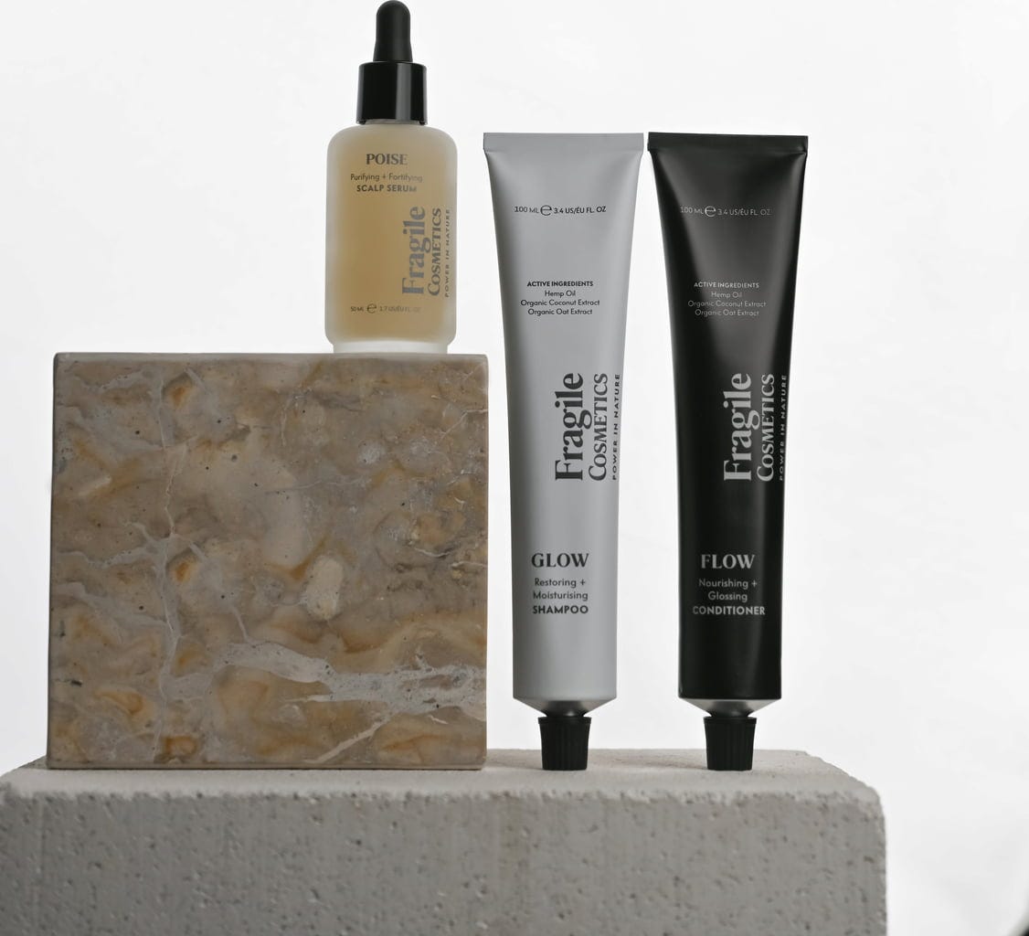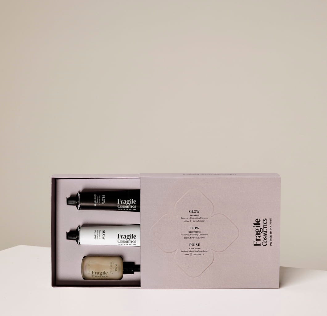 De 3 STAPPEN Haarverzorgingskit van Fragile Cosmetics bevat de drie belangrijkste producten voor je haarverzorgingsroutine: Een shampoo, een conditioner en een ongeëvenaarde intensieve behandeling voor haar en hoofdhuid. De reisklare set zorgt voor verzorgd en sterk haar met stijl.