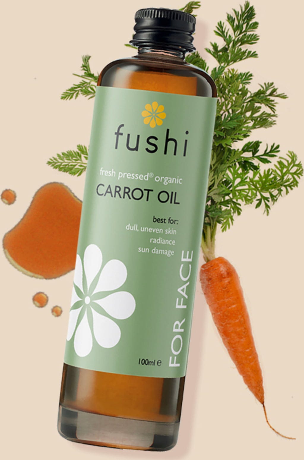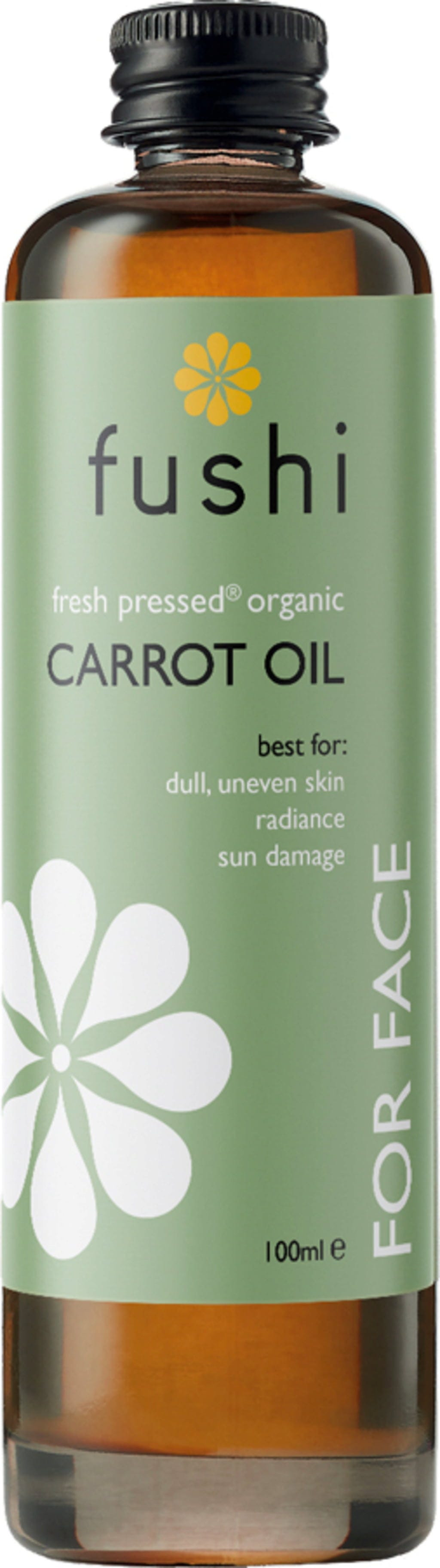 Fushi's wortelolie wordt gewonnen uit hele wortels die rijk zijn aan bètacaroteen, vitamine A, B, C, D, E en essentiële vetzuren. Het hoge bètacaroteengehalte betekent dat de olie uitstekend is in het regenereren van door de zon beschadigde huid. Een hydraterende, koudgeperste olie die zowel droog en volwassen huidtypes als droog haar ten goede komt.