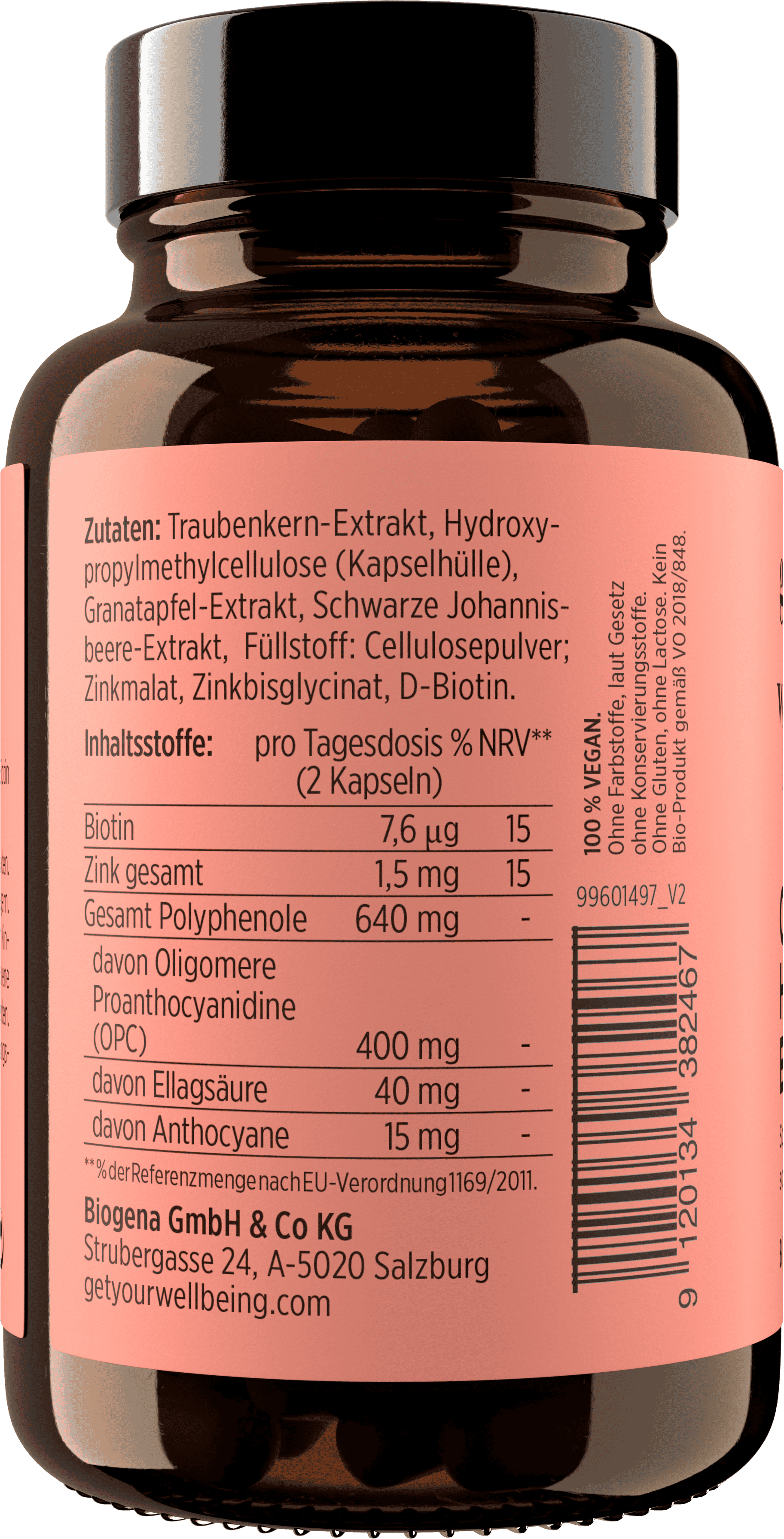 druivenpitextract, hydroxypropylmethylcellulose (omhulsel van capsule), Granaatappel vruchtextract, Zwarte bes extract, cellulosepoeder, zinkmalaat, zinkbisglycinaat, D-biotine