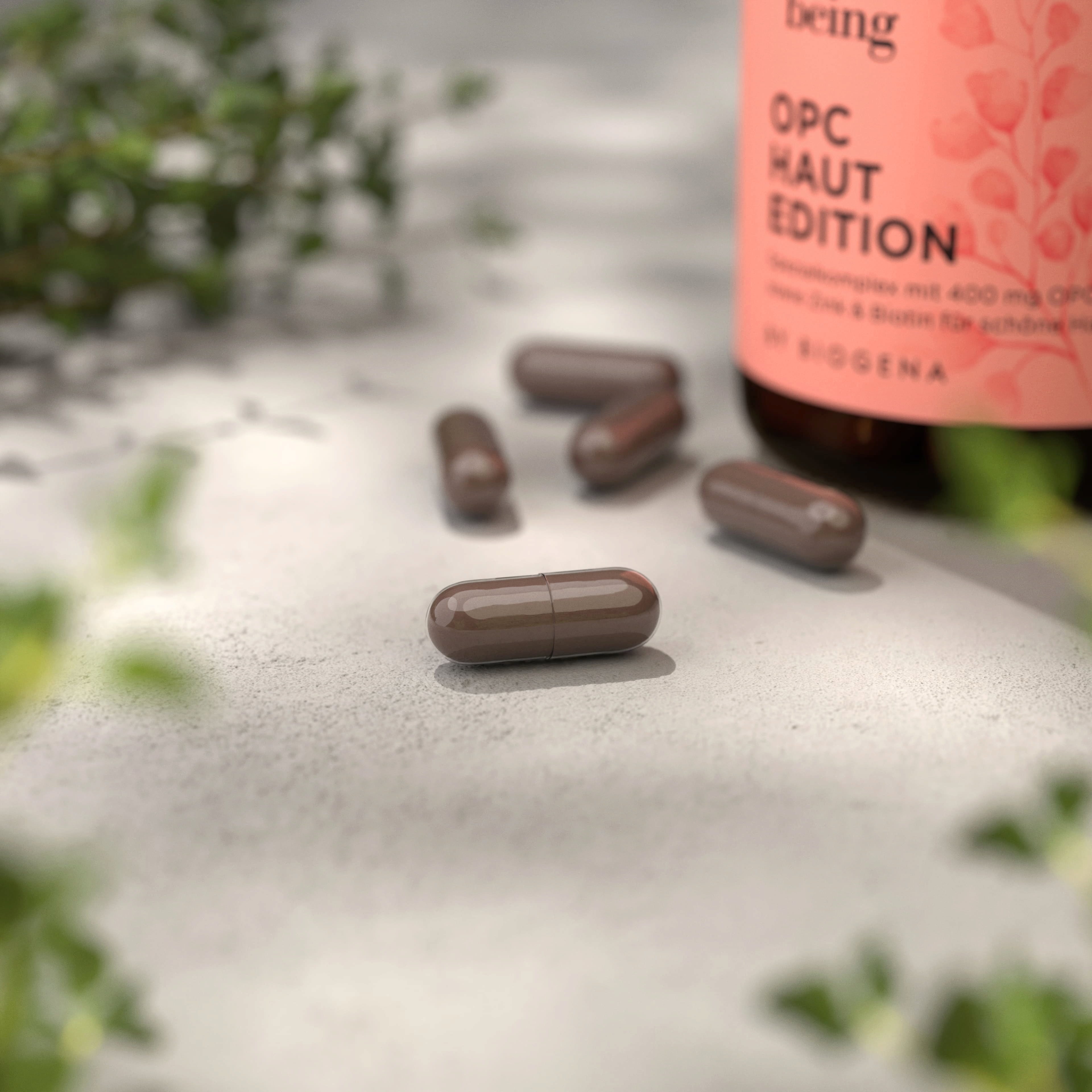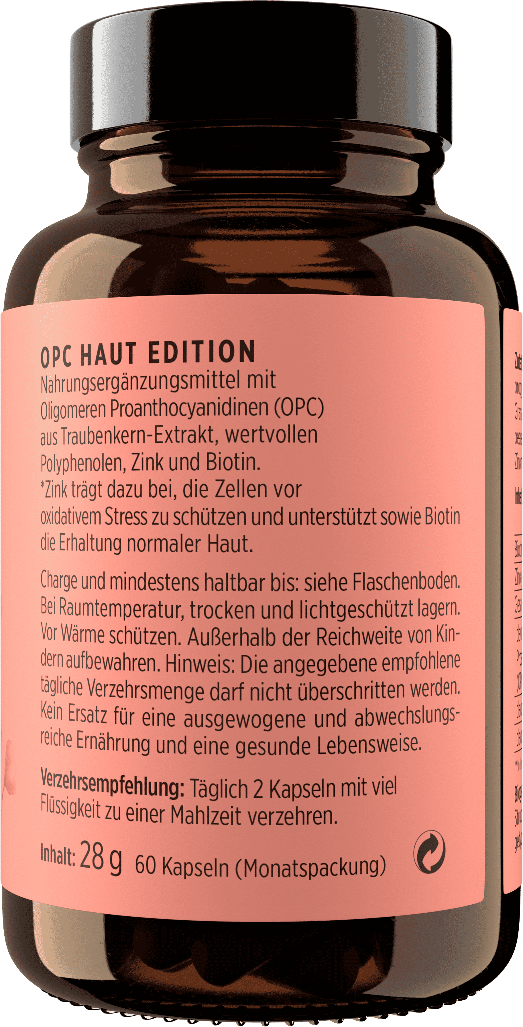 OPC Skin Edition combineert 400 mg OPC uit druivenpitextract van hoge kwaliteit met natuurlijke polyfenolen, zink uit twee goed verdragen verbindingen en biotine.