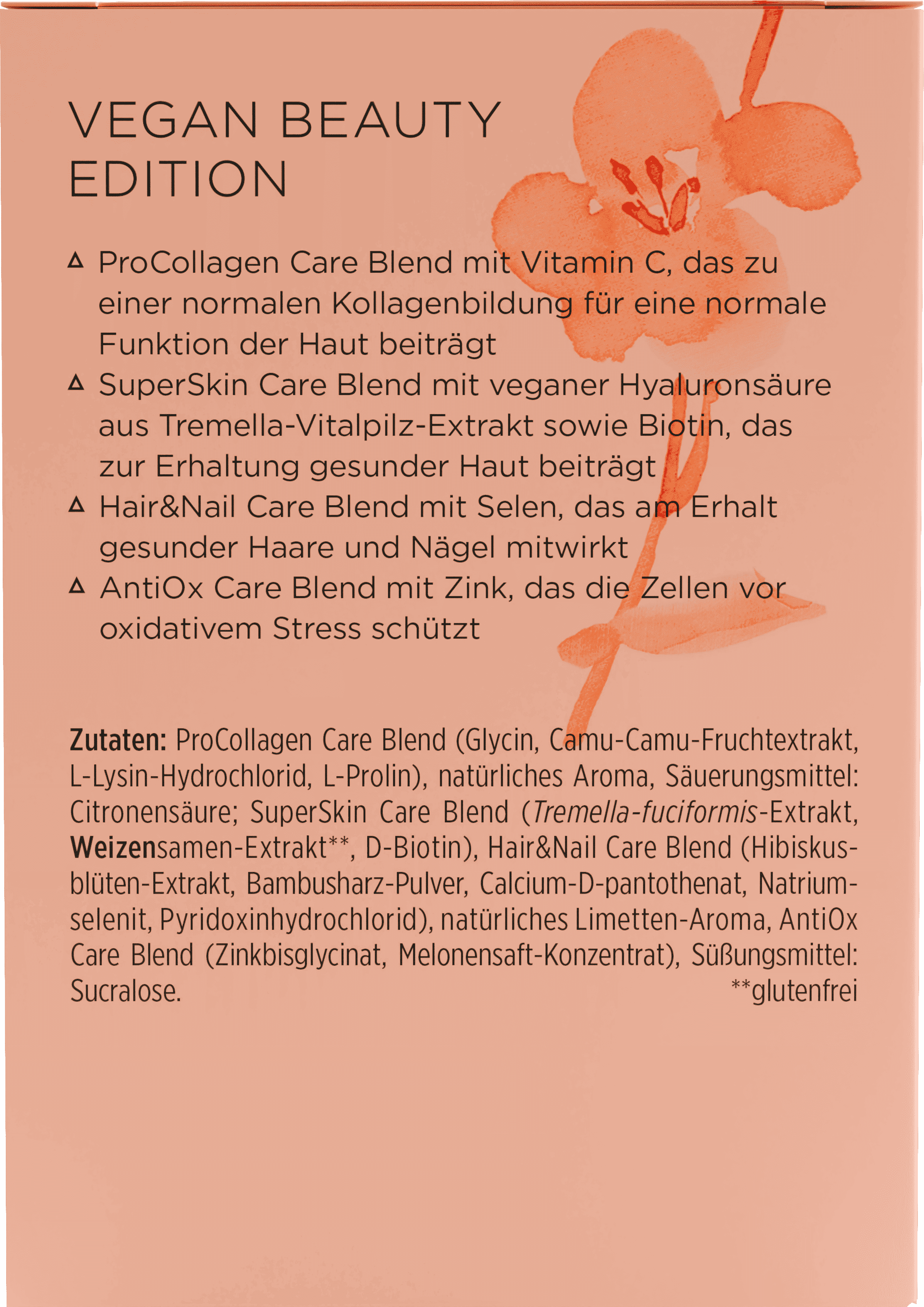 ProCollagen Care Blend (Glycin, camu-camuvruchtenextract, L-lysine hydrochloride, L-Prolin), natuurlijk aroma, zuurteregelaar (citroenzuur (E330)), SuperSkin Care Blend (Tremella fuciformis-extract, tarwezaadextract[1], D-biotine), Hair&Nail Care Blend (hibiscusbloemextract, bamboe hars poeder, Calcium-D-pantothenat, natriumseleniet, Pyridoxinhydrochlorid), limoensmaak, AntiOx Care Blend (zinkbisglycinaat, meloensapconcentraat), zoetstof (Sucralose)