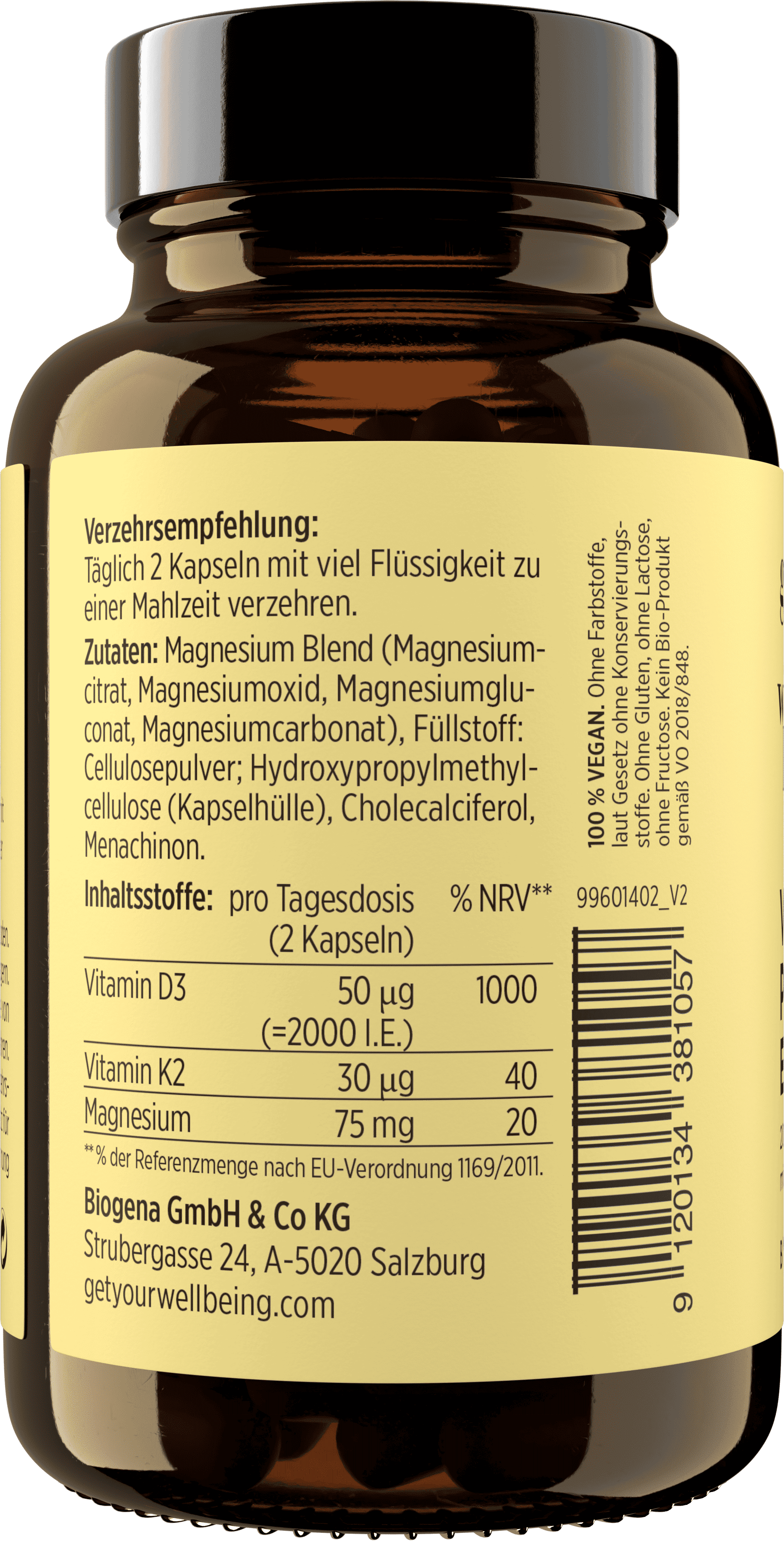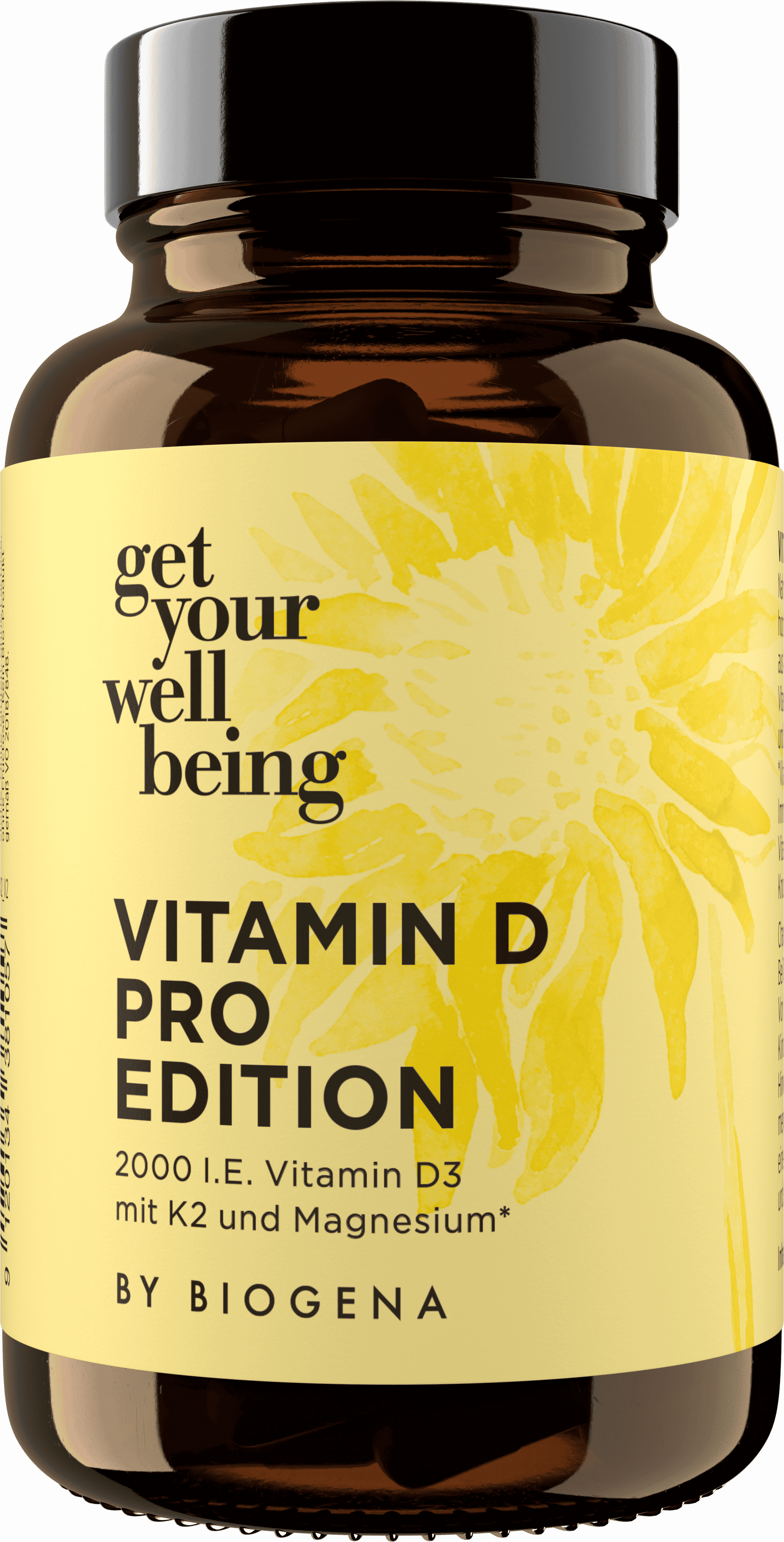 De Vitamine D Pro Edition van get your wellbeing by BIOGENA bevat veganistisch, hoog gedoseerd vitamine D3 uit algen, bekend als zonnevlaams vitamine. Het speciale complex bevat ook magnesium uit 4 verbindingen en vitamine K2 dat fungeert als all-trans-menachinon-7. Ideaal voor mensen die op zoek zijn naar een specifiek vitamine D-monopreparaat en de synergetische voordelen willen benutten.