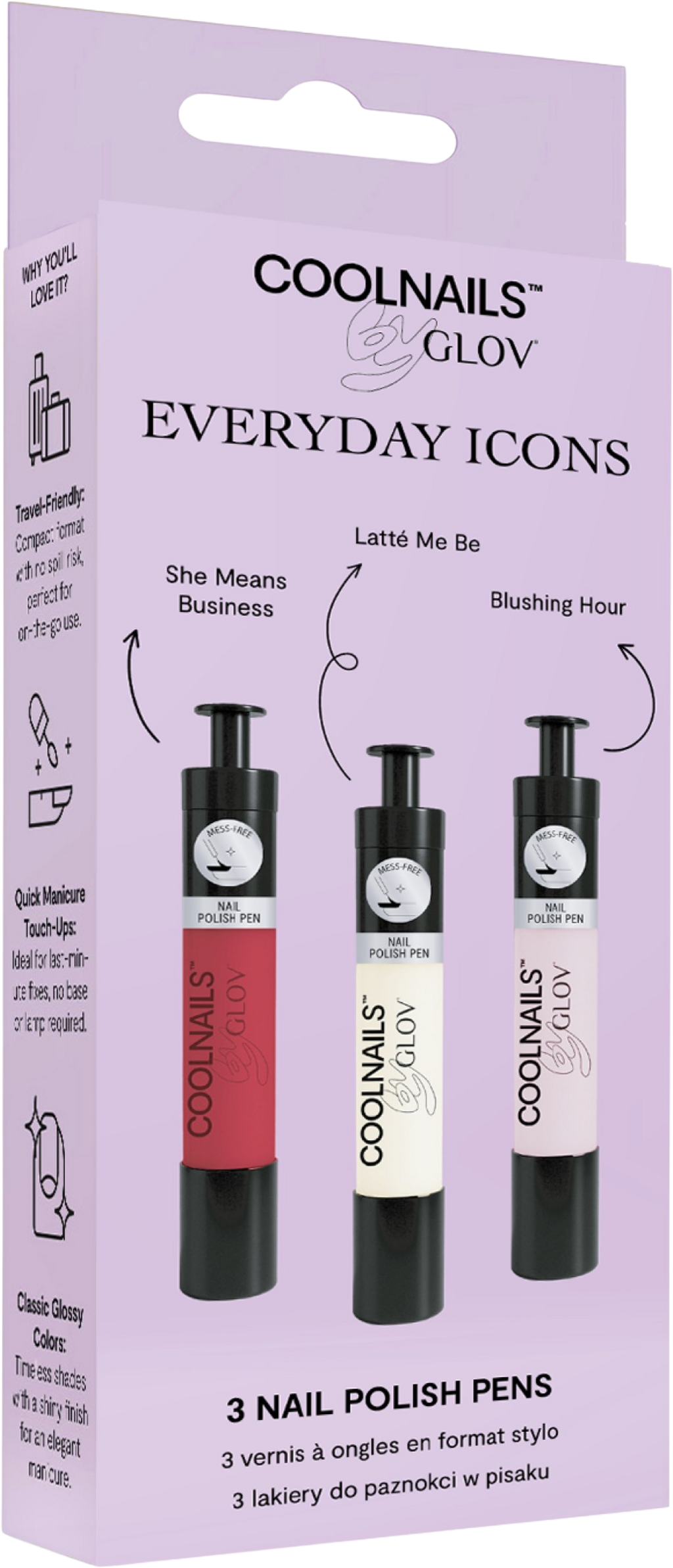 Het Everyday Icons Set van GLOV zorgt ervoor dat je nagels er altijd perfect uitzien. Het bevat drie nagellakpennen in schitterende kleuren die je eenvoudig en snel kunt aanbrengen, zelfs onderweg. De lakken zijn sneldrogend en perfect voor last-minute updates of een spontane glamourlook.