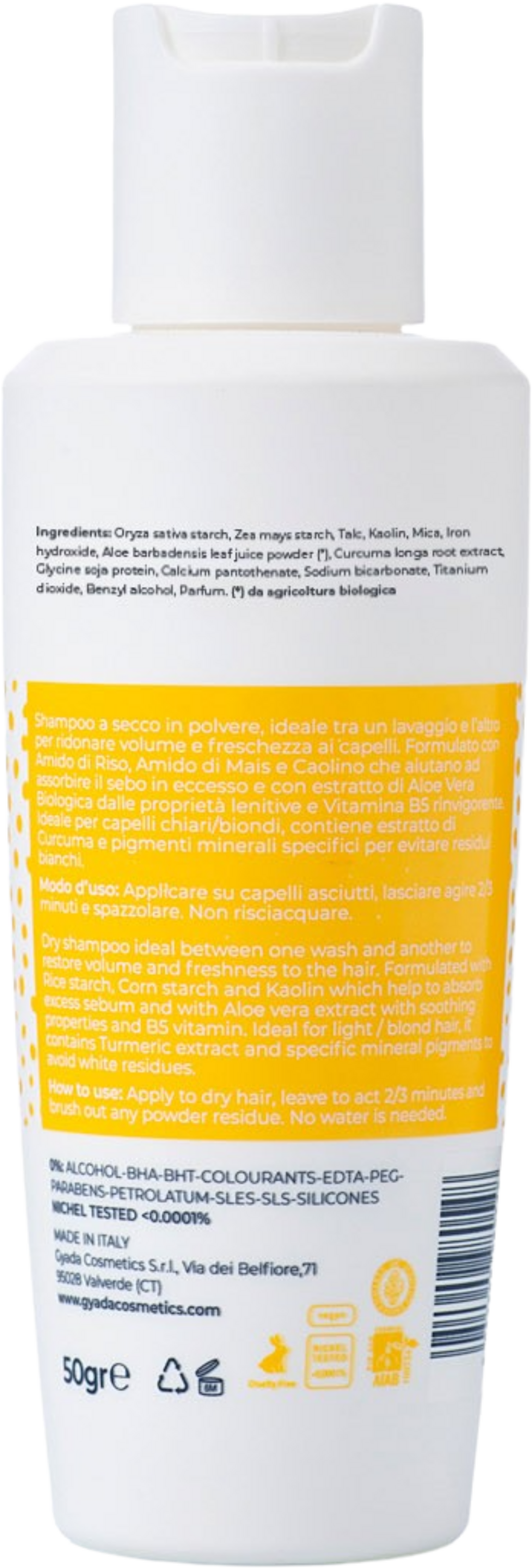 Deze droogshampoo is speciaal geformuleerd voor blond haar. Het bevat kurkuma-extracten en speciale minerale pigmenten die witte resten op het haar voorkomen. Het product is ideaal om het haar nieuw volume en frisheid te geven tussen wasbeurten door. De formule op basis van rijst- en maïszetmeel en kaolien absorbeert overtollig talg, terwijl kalmerende biologische aloë vera en revitaliserende vitamine B5 het haar verzachten.