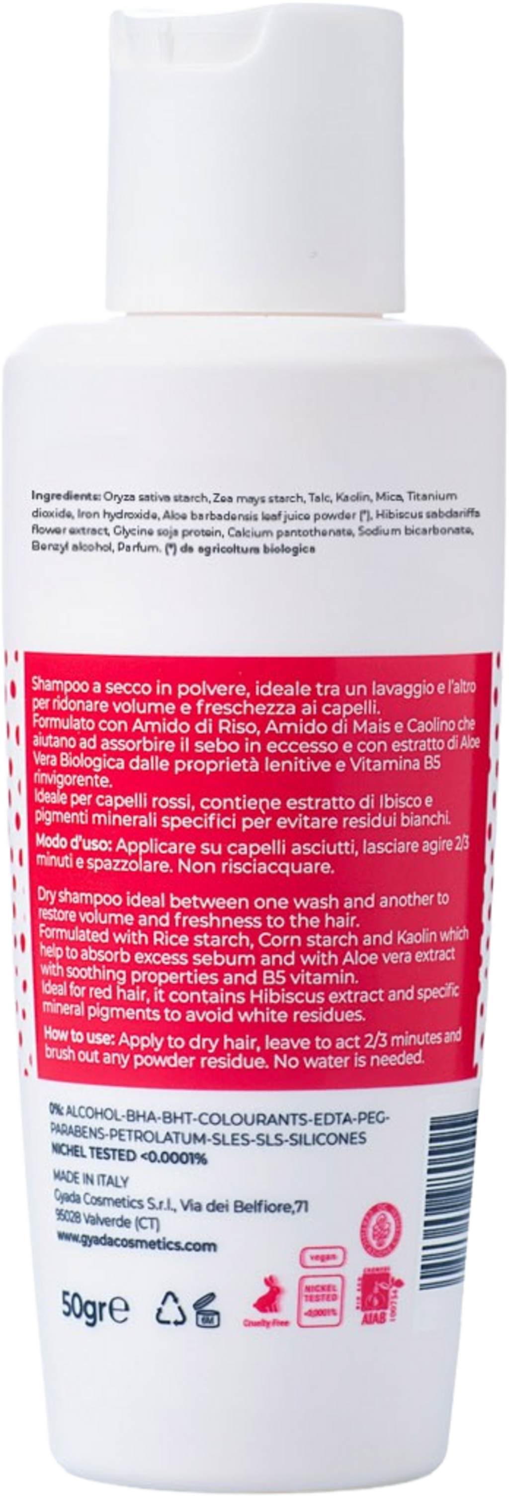 Dankzij extracten van hibiscus en speciale minerale pigmenten is het ideaal voor rood haar en zorgt het ervoor dat er geen witte resten zichtbaar zijn in het haar. Het droogshampoo poeder met rijst- en maïszetmeel en kaolien absorbeert overtollig talg en voedt met biologische aloë vera en vitamine B5. Het verfrist het haar tussen wasbeurten door, voegt volume toe en kan de tijd tussen wasbeurten verlengen.