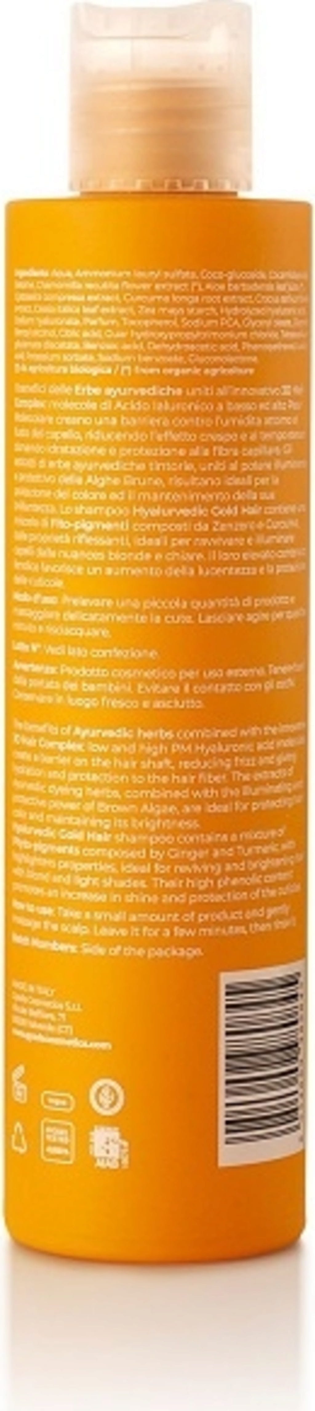 De shampoo combineert de kracht van Ayurvedische kruiden met een innovatief 3D-haarcomplex samengesteld uit hyaluronzuur met verschillende molecuulgewichten. De moleculen vormen een beschermende barrière rond de haarschacht, zorgen voor vocht en maken de lokken glad. Ayurvedische kruiden, gember en kurkuma, voegen mooie tonen toe aan licht en blond haar en versterken zo de natuurlijke tint. Neutrale henna en kamille zorgen voor een milde reiniging, verhelderen de lokken en geven een algehele zachtheid.