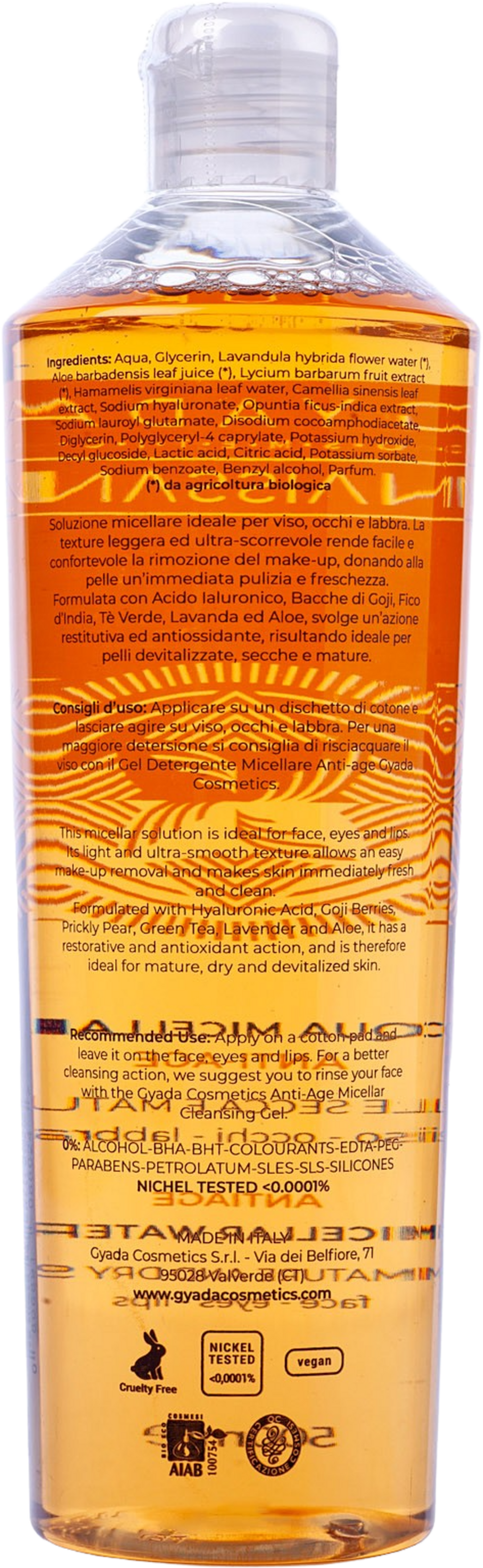 Het Anti-Age Micellaire Water van GYADA Cosmetics reinigt zacht het gezicht, de ogen en de lippen. De lichte, vloeibare textuur verwijdert make-upresten voor een frisser en schoner huidgevoel. Het reinigingsmiddel is speciaal ontwikkeld om te zorgen voor een rijpe, vermoeide en droge huid en is rijk aan antioxidanten. Regenererende actieve ingrediënten zoals hyaluronzuur, gojibessen, barbary vijg, groene thee, aloë en lavendel zijn ook opgenomen.