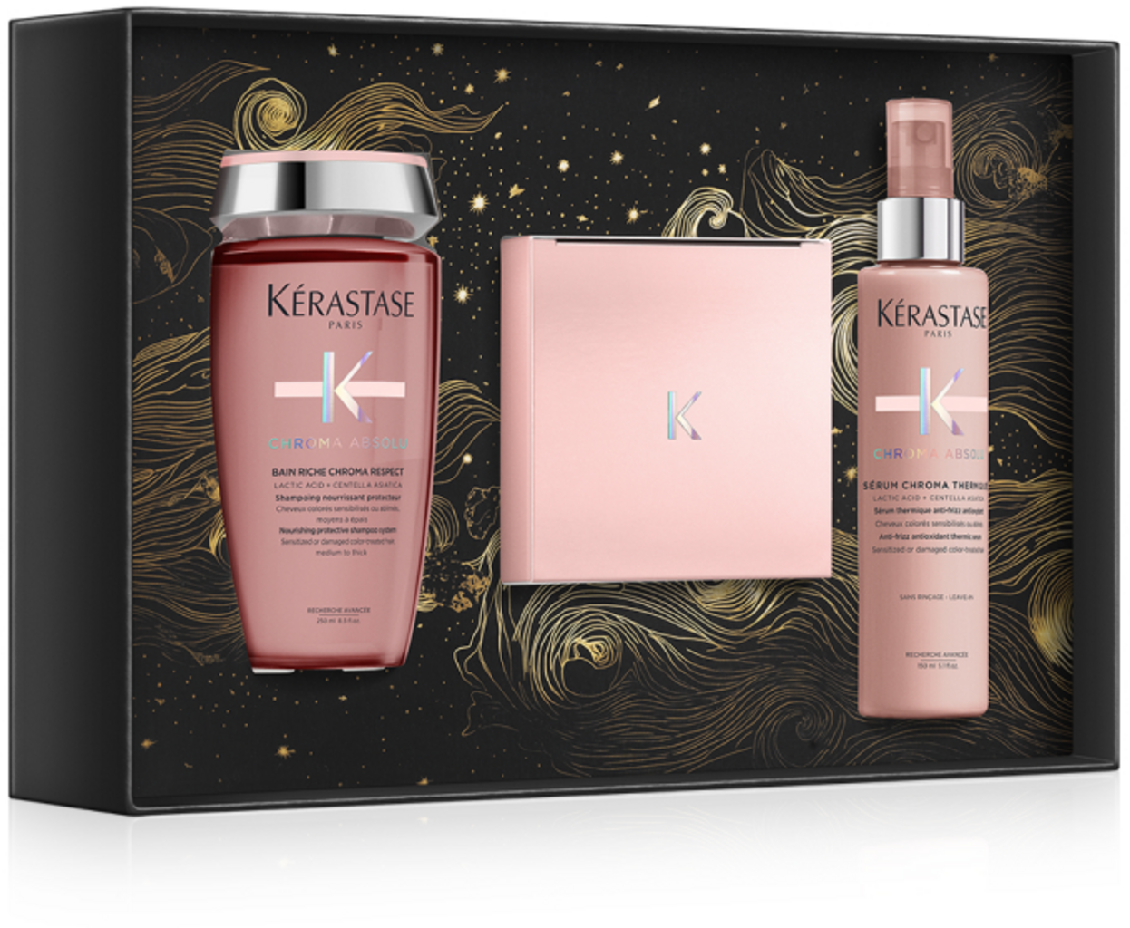 Ontdek de Chroma Absolu routine in een praktische cadeauset. Chroma Absolu is perfect afgestemd op de behoeften van je gestresste of beschadigde haar, vooral na het kleuren. Je haar wordt intensief gehydrateerd, gladder en meer gevoed. Je kleur blijft ook langer stralen. Het trio van Kérastase biedt alles wat je nodig hebt voor een perfecte verzorging: een hydraterende, kleurbeschermende shampoo, een masker en een leave-in treatment. De voedende Bain Riche Chroma Respect reinigt je haar op milde wijze, het Masque Chroma Filler vult poreuze structuren op en het Serum Thermique beschermt je haar tegen hitte. Deze kleurverzorgingslijn geeft je glad en langdurig mooi haar.