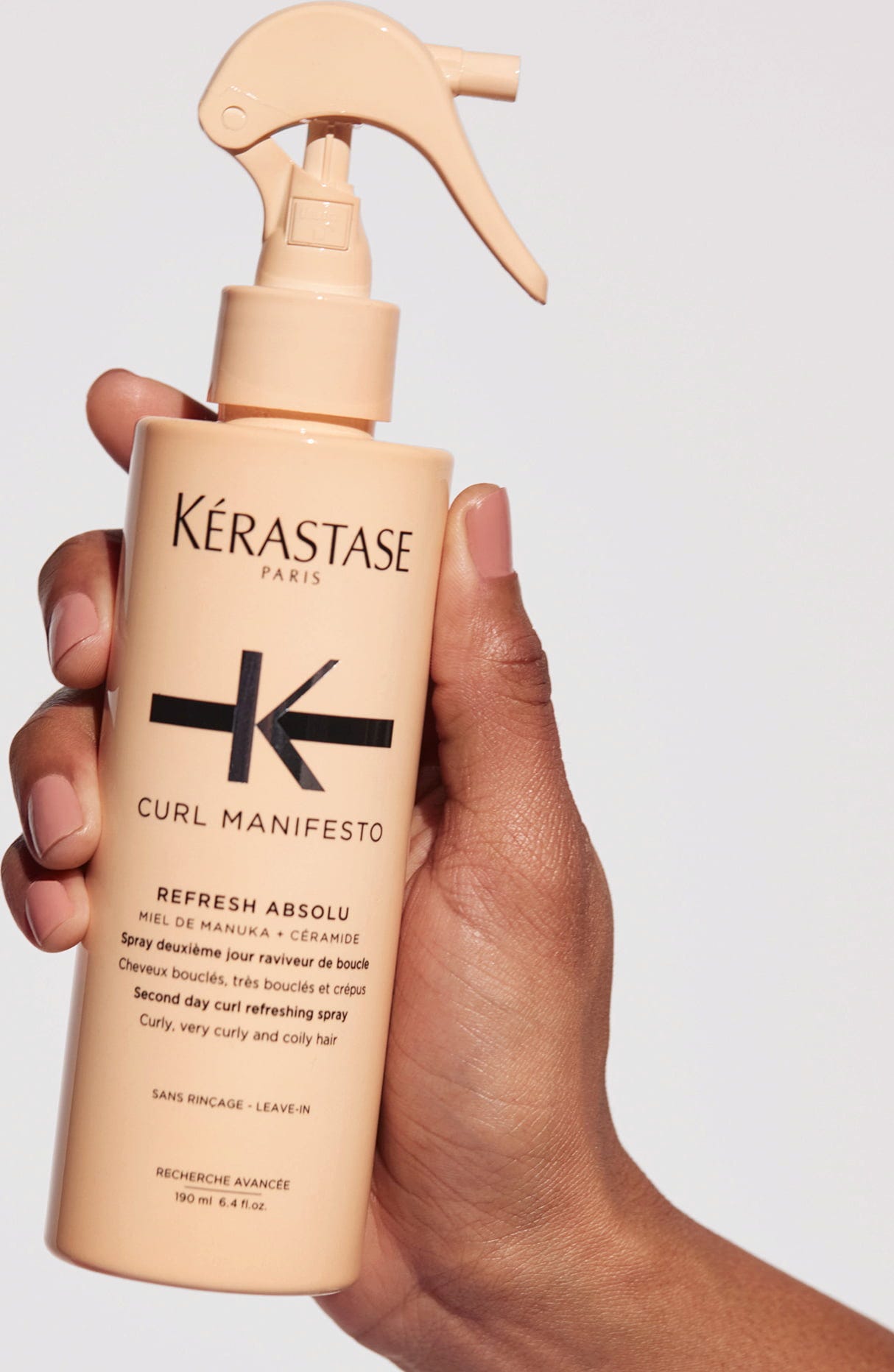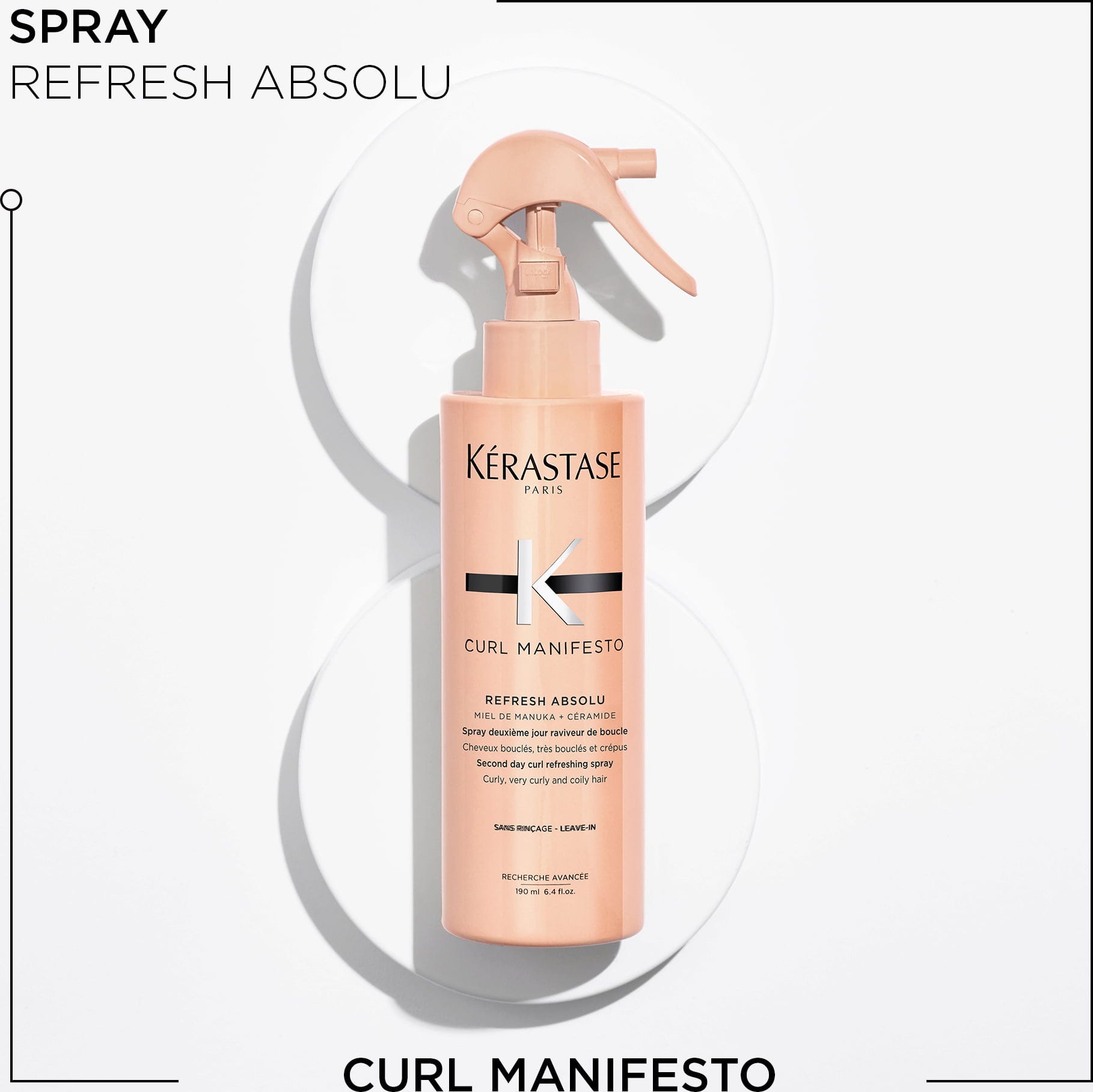 De Refresh Absolu is een tweede-dags krulverfrissende spray die is ontwikkeld voor krullende, zeer krullende en krullende haartypes. Het bevordert de natuurlijke kruldefinitie en verfrist het haar. Geformuleerd met manukahoning en ceramiden.