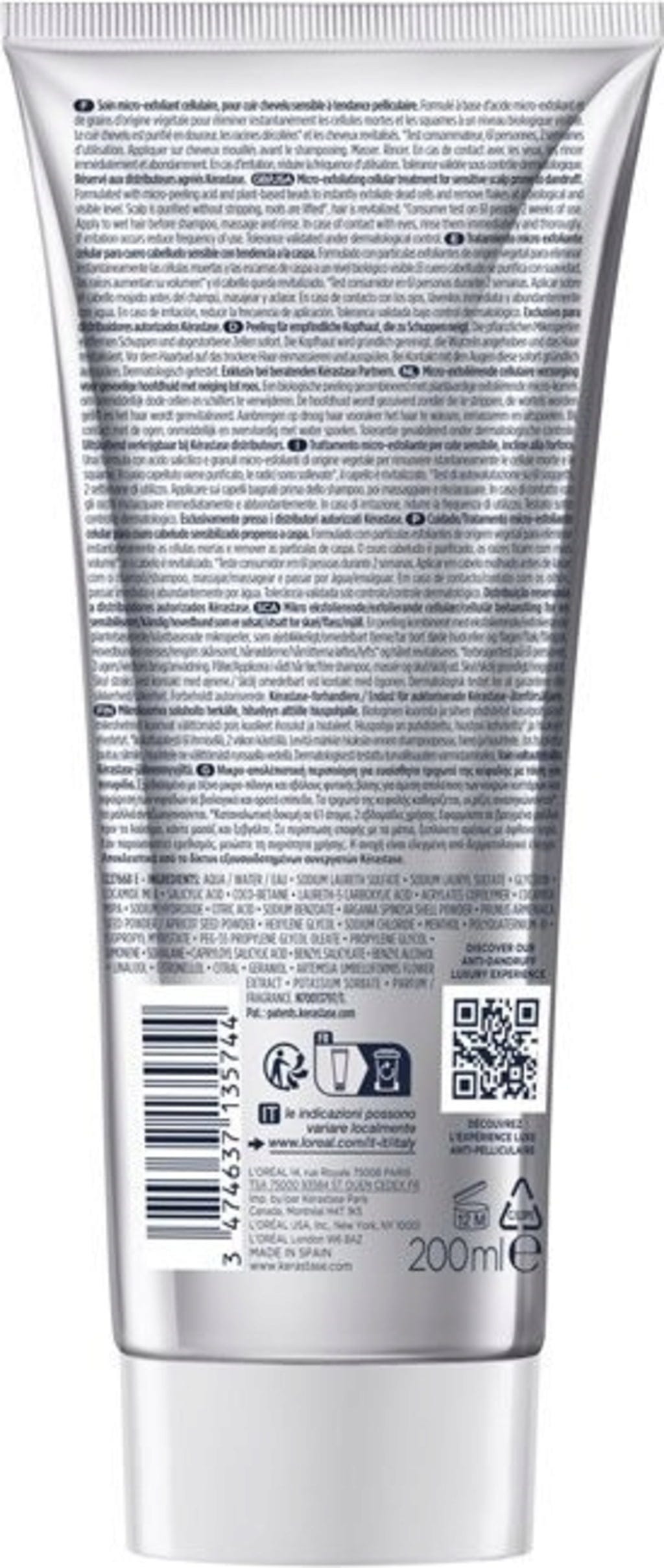 De Symbiosis Micro-Peeling Cellulaire van Kérastase verfrist de hoofdhuid en verwijdert op betrouwbare wijze schilfers en roos. Salicylzuur en plantaardige exfoliërende deeltjes verminderen zichtbaar roos op chemische en mechanische wijze.