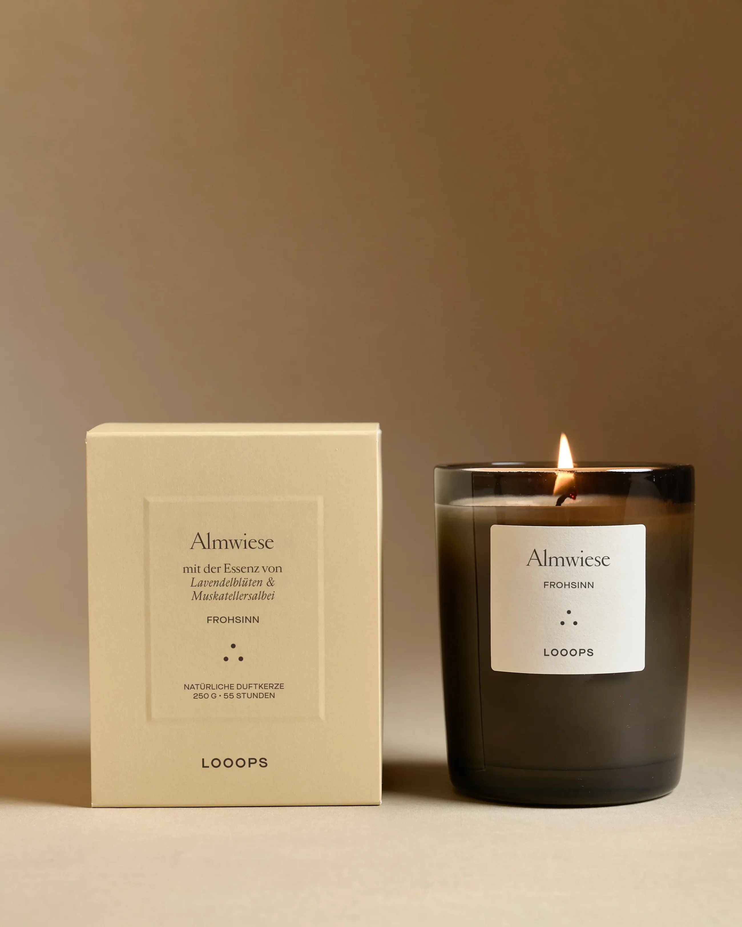 De Geurkaars Almweide van LOOOPS roept warme lichten en bloeiende weiden op, met een gevoel van lichtheid. De geurcombinatie van kruiden zoals lavendel, balsemachtige muskaatsalie en frisse pepermunt scherpt de zintuigen en zorgt voor een gevoel van levensvreugde.