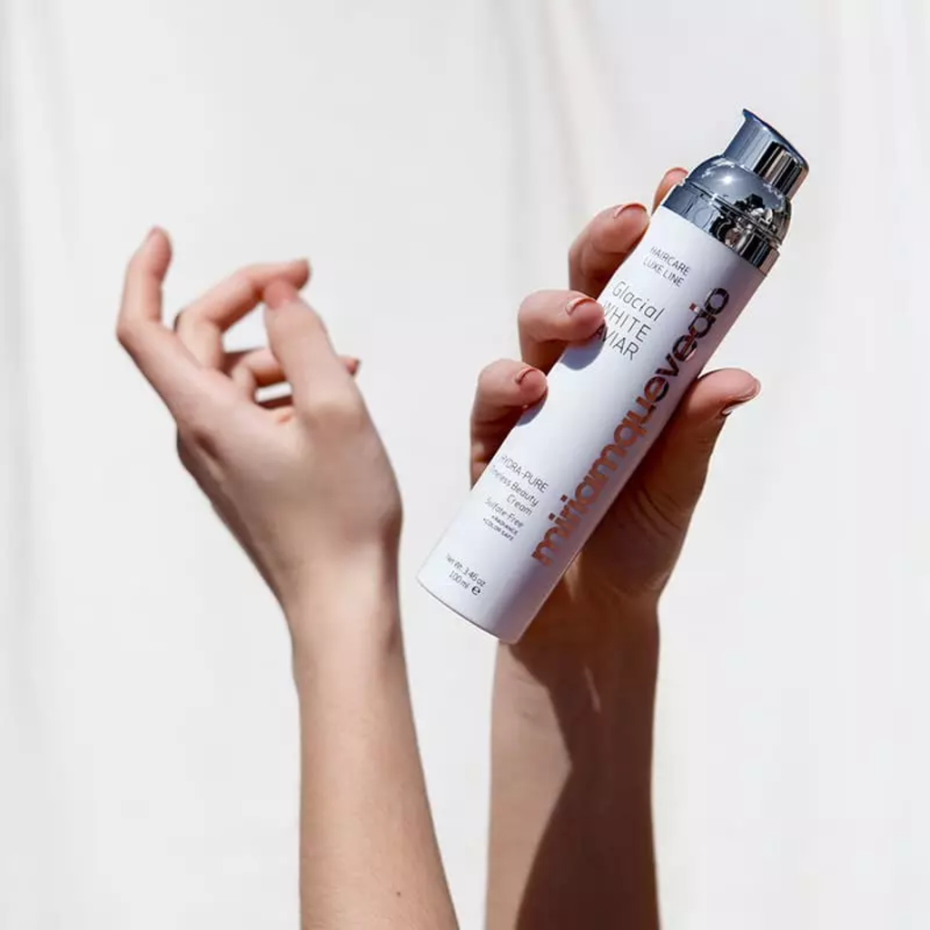 De Glacial White Caviar Hydra-Pure Timeless Beauty Cream van Miriam Quevedo bevat een unieke formule met wit kaviaarextract, ingekapseld Zwitsers gletsjerwater en een keratinecomplex. Het biedt intense hydratatie en repareert beschadigde haarstructuren. De stylingcrème beschermt ook tegen kleurverlies en uitdroging door hitte, blootstelling aan licht of chemicaliën. De ingebouwde edelsteenpartikeltjes reflecteren licht voor een stralende glans. Bovendien maakt de crème het haar zijdezacht en kroesvrij.