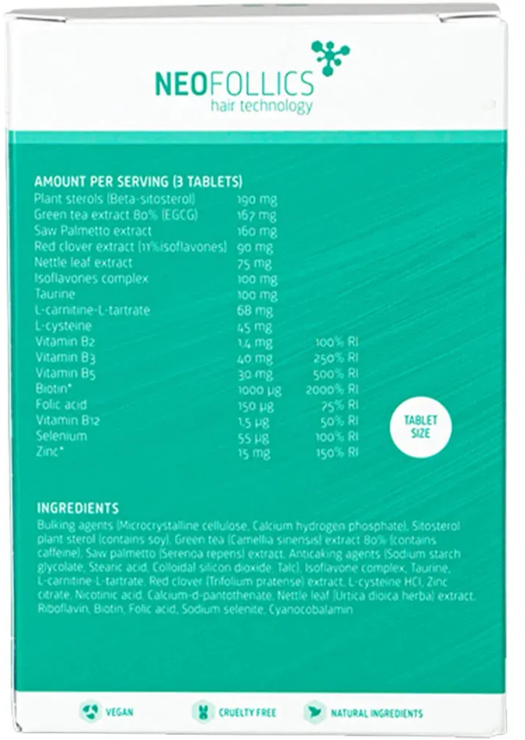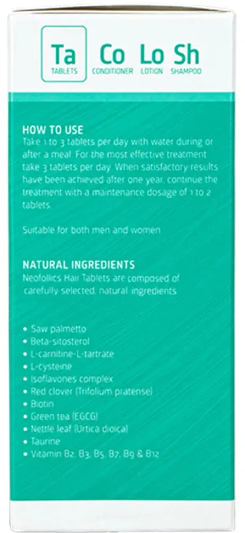 Neofollics Haargroeitabletten pakken dit probleem aan met natuurlijke extracten zoals zaagpalmextract, bèta-sitosterol, brandnetelextract, rode klaver extract, ECGC en isoflavonen, die de vorming van DHT remmen, de haargroei stimuleren en haaruitval verminderen.