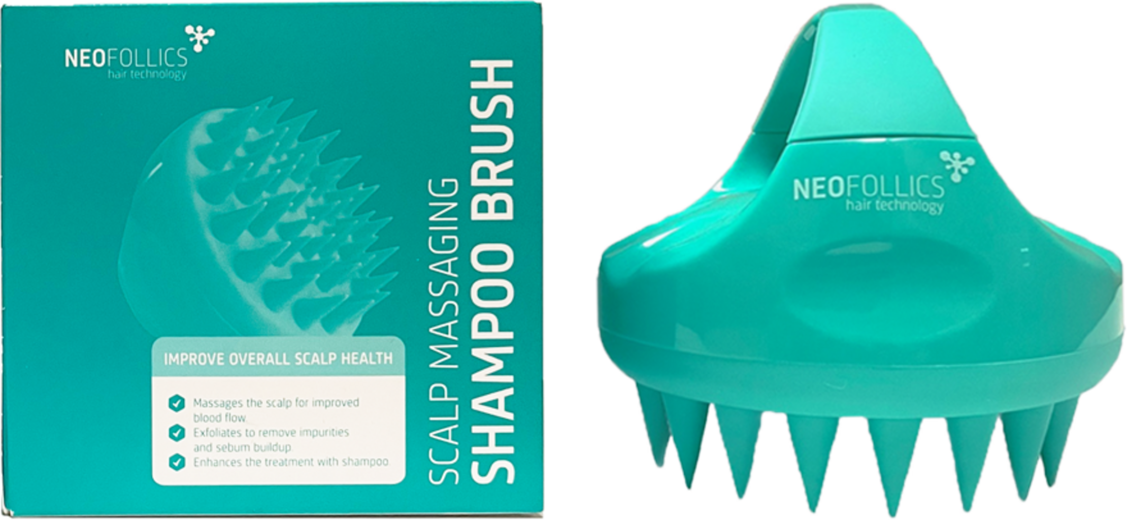 - Als aanvulling kan Neofollics Shampoo of Neofollics Conditioner op de massageborstel worden aangebracht en in de hoofdhuid en het haar worden gemasseerd.