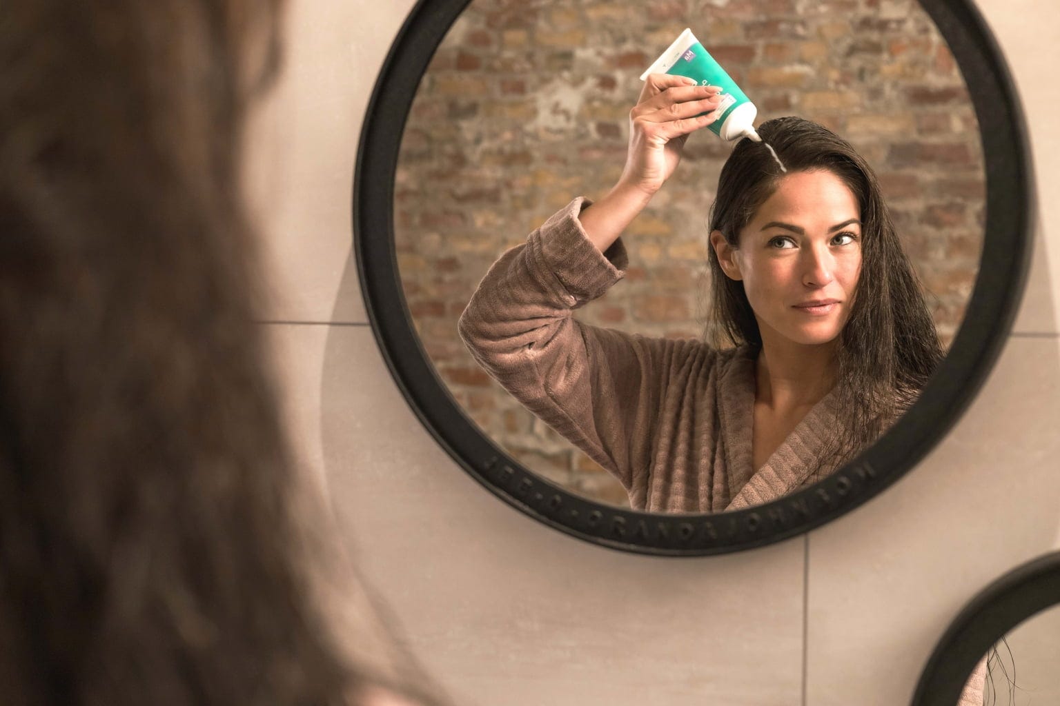 - Scheid het haar, breng het masker direct op de hoofdhuid aan en masseer het in. Niet uitspoelen!