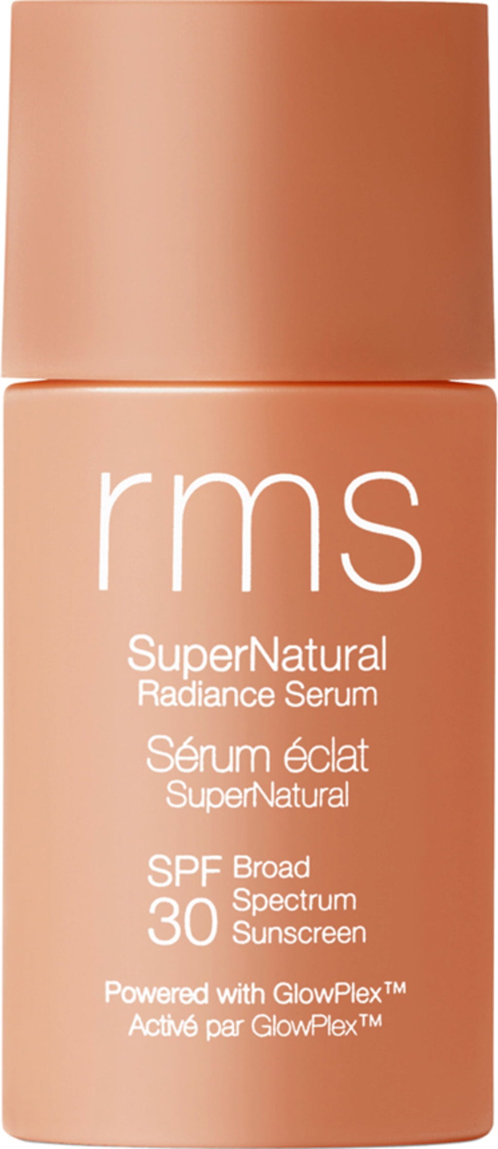 Het SuperNatural Radiance Serum SPF 30 van RMS Beauty kleurt, verzorgt en corrigeert de teint en biedt ook een minerale breedspectrum bescherming met factor 30. De lichte textuur past zich aangenaam aan de huid aan, laat onregelmatigheden verdwijnen, geeft een natuurlijke glans en zorgt voor een soft-focus effect. GlowPlexTM komt hier in actie, een complex van niacinamide en natuurlijke peptiden uit quinoa-extract en erwt-extract. Dit maakt de huid nog gladder en geeft direct meer uitstraling. Verder bevat het serum ijzeroxiden en rozen geraniumextract die ook bescherming bieden tegen blauw licht.