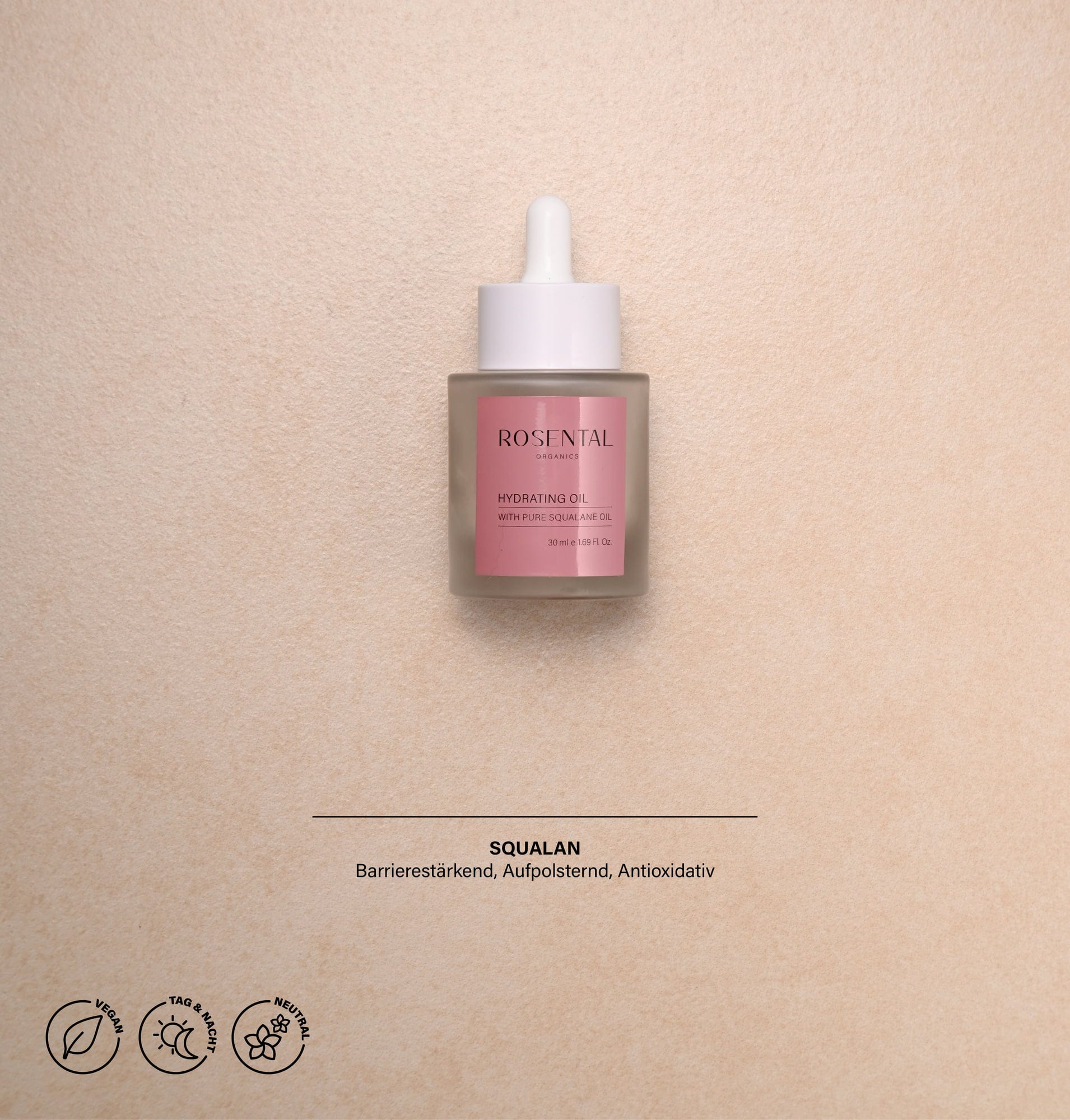 De Hydrating Oil van Rosental Organics bevat fytosqualan, dat intensieve hydraterende eigenschappen heeft en wordt verkregen uit de resten van de olijfpers. Het wordt als bijzonder huidvriendelijk beschouwd en voorkomt uitdroging van de huid. Bij regelmatig gebruik worden fijne lijntjes en rimpels optimaal gladgestreken. De gezichtsolie heeft ook antioxiderende eigenschappen, en beschermt je huid tegen vrije radicalen en milieu-invloeden. De textuur is zeer licht, trekt snel in en laat geen vettig laagje achter op de huid.