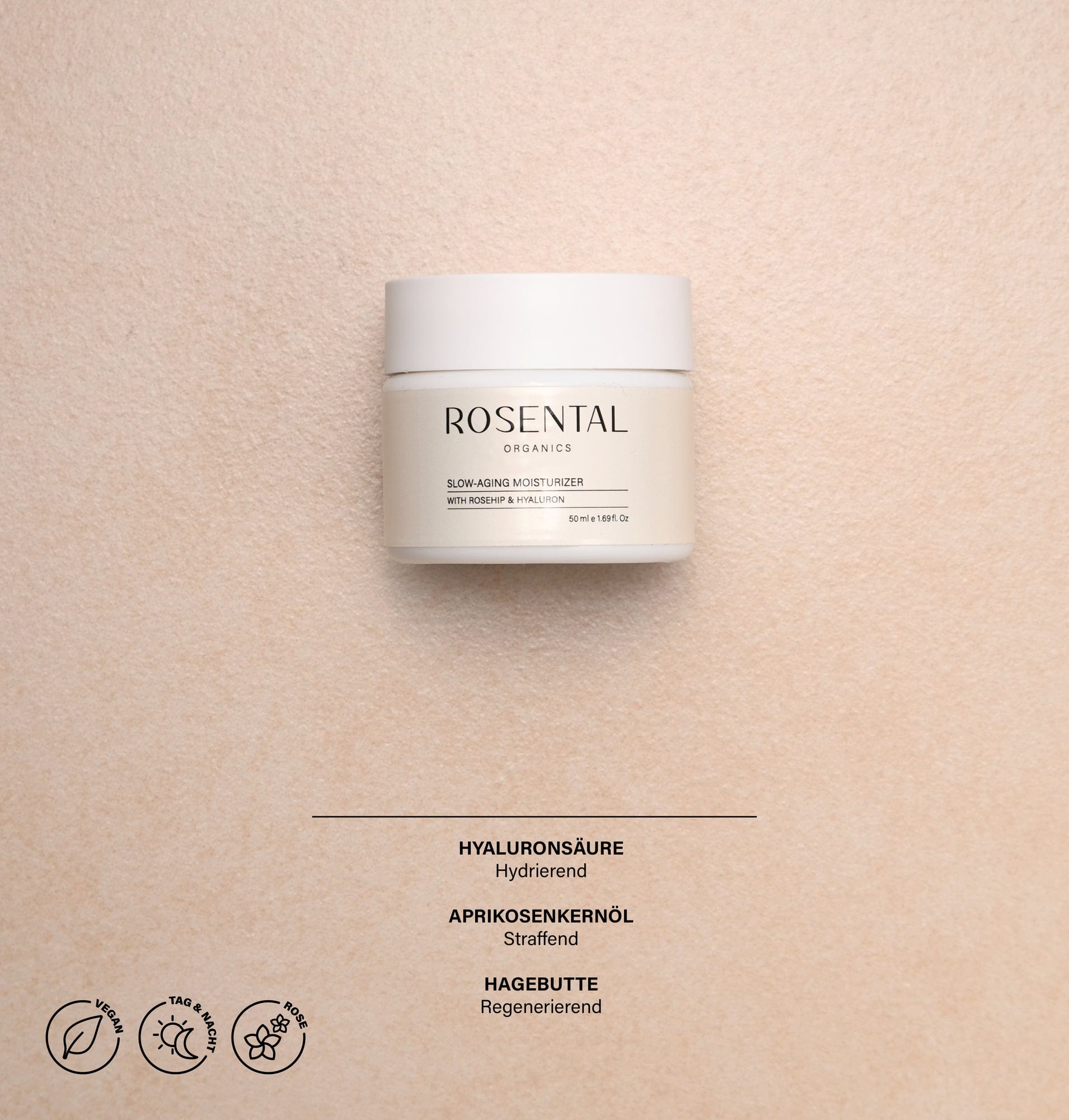 Dankzij de waardevolle ingrediënten gaat de Slow-Aging Moisturizer van Rosental Organics de eerste tekenen van huidveroudering tegen. Vitamine A en E verbeteren de elasticiteit van de huid. Tegelijkertijd worden pigmentvlekken geminimaliseerd en fijne lijntjes en rimpels gladgestreken. Rozenwater en hooggeconcentreerd hyaluronzuur zorgen voor een frisse teint en verzorgen je gezicht intensief met vocht, terwijl abrikozen- en rozenolie voor een egale teint zorgen.