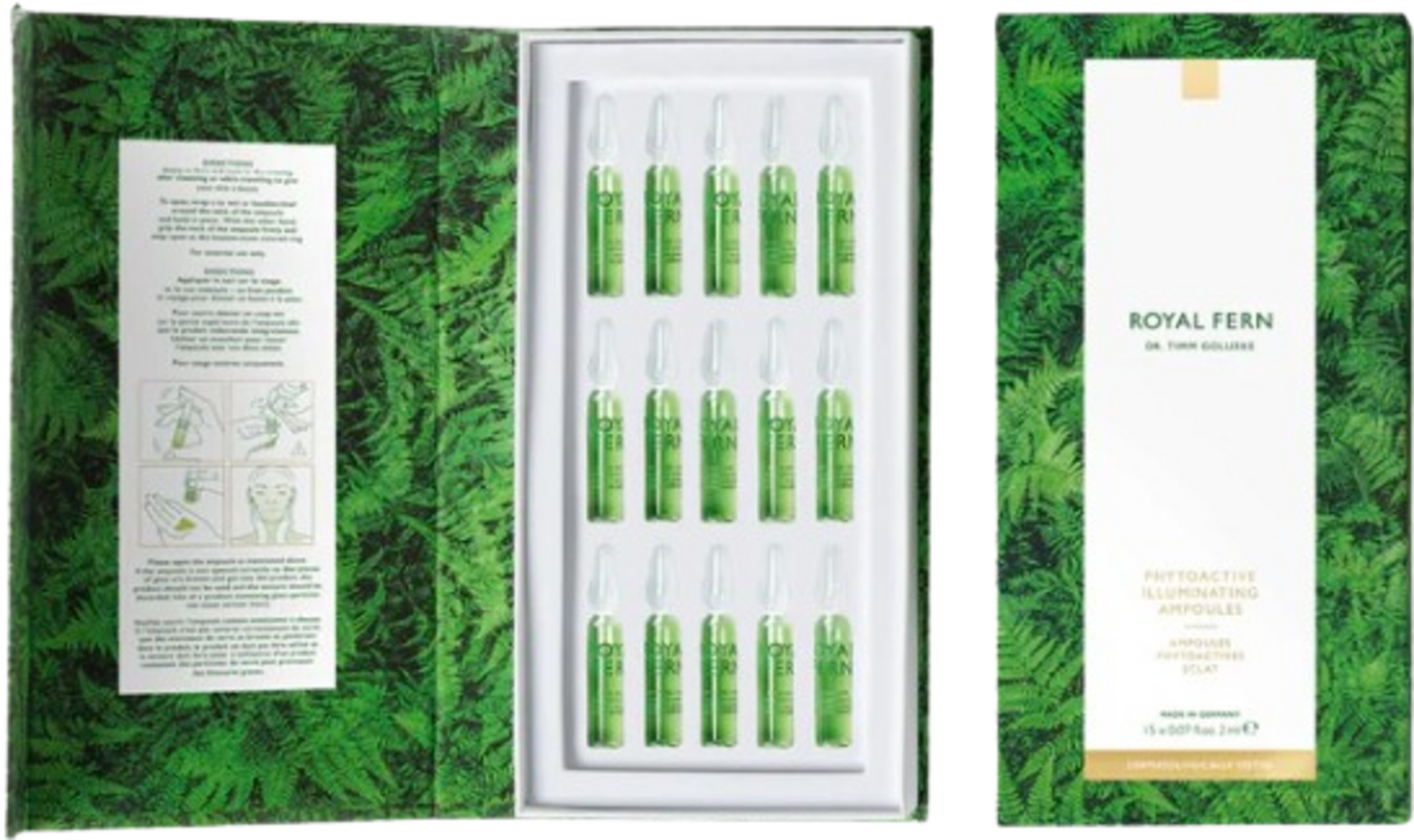 De Phytoactive Illuminating Ampoules van Royal Fern bevatten hooggeconcentreerde plantaardige actieve ingrediënten die de huid voorzichtig verhelderen en een prachtige uitstraling geven. Dit gebeurt door de vermindering van overtollige pigmentproductie en door de stimulatie van de lichaamseigen collageensynthese. Daarnaast optimaliseren hyaluronzuur en niacinamide de vochtreserve van de huid, waardoor deze zichtbaar voller, gladder en egaler uitziet. Bovendien bieden de ampullen een sterk antioxiderend en reparerend effect en herstellen ze de celenergie om beschadigde structuren te ordenen. Geniet van het unieke directe effect, want bij elke toepassing krijgt je huid een betere helderheid.