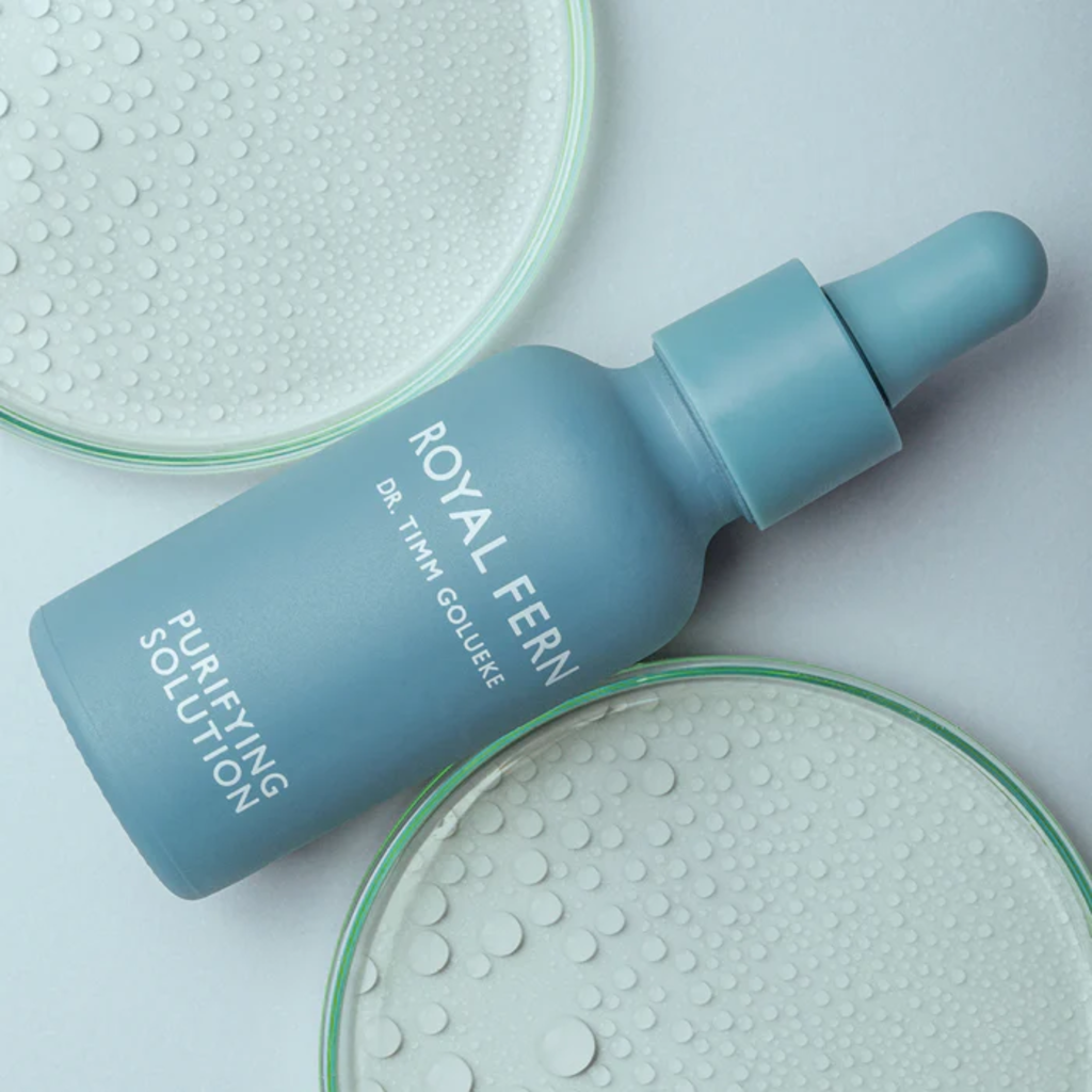 De Purifying Solution van Royal Fern is speciaal geformuleerd voor een onevenwichtige huid en onzuiverheden. Het bestrijdt vergrote poriën en puistjeslittekens en reguleert de talgproductie. Het zuiverende serum is verrijkt met een exfoliërend extract van witte wilgenbast en retinol, en bestrijdt niet alleen mee-eters en onzuiverheden, maar verheldert ook de huid. Ondersteuning komt van tranexaminezuur, dat daarnaast verkleuringen na huiduitbraken vermindert. Bovendien bevat het zink-PCA en monnikspeper, die hormonale onzuiverheden tegengaan. Zink is een essentieel mineraal dat het lichaam zowel van binnen als van buiten ondersteunt, de cellen regenereert en de talgproductie in balans houdt. En om te zorgen dat je huid helder en stralend blijft, behouden niacinamide en hyaluronzuur het natuurlijke vochtgehalte en de beschermende barrière van de huid.