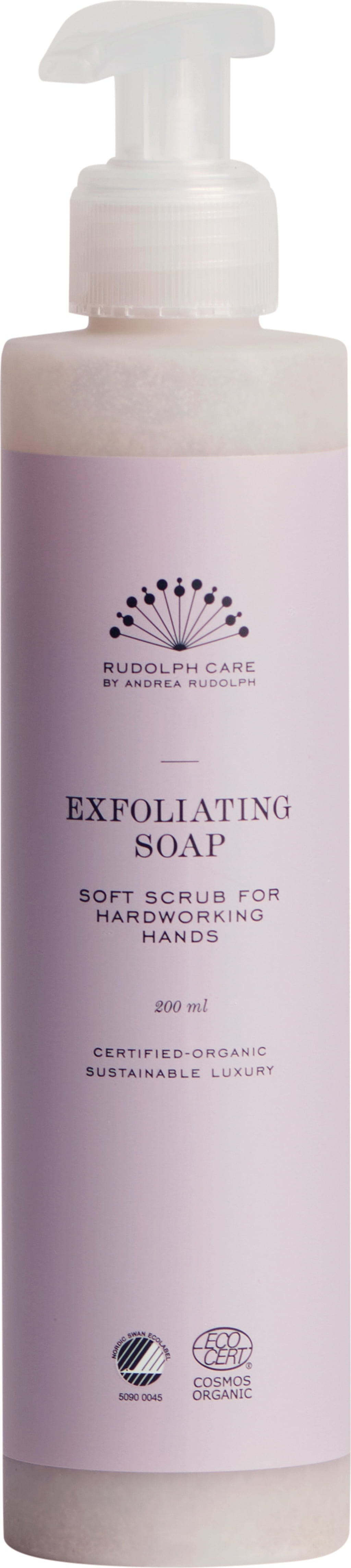 De Exfoliating Soap is een exfoliërende en verzorgende vloeibare handzeep van Rudolph Care. De zeep reinigt de handen, maakt ze zacht en heeft een lichte exfoliërende werking. Het peelend effect wordt verkregen door abrikozenpitgranulaat en fijne schuurkorrels van het natuurlijke mineraal siliciumdioxide. Voor de optimale hydratatie zorgt de aanwezige Acai.