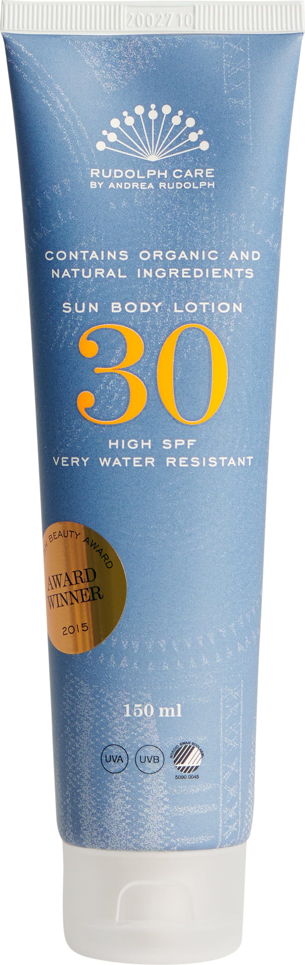 Een beschermende en hydraterende zonnebrandlotion met SPF 30. De lotion biedt effectieve bescherming tegen de schadelijke UVA- en UVB-stralen van de zon. Daarnaast is deze zonnebrand zeer waterbestendig en beschermt ook nog na het zwemmen, mits je je niet te sterk afdroogt met de handdoek. De hoge concentratie aan natuurlijke ingrediënten zoals duindoorn, rijk aan vitamine C, kalmerende kamille en hydraterende komkommerextract. De Sun Body Lotion van het Scandinavische merk Rudolphs Care heeft een milde zomerse geur en een fijne, lichte textuur. De lotion trekt snel in zonder te glimmen, plakken of een witte waas achter te laten.