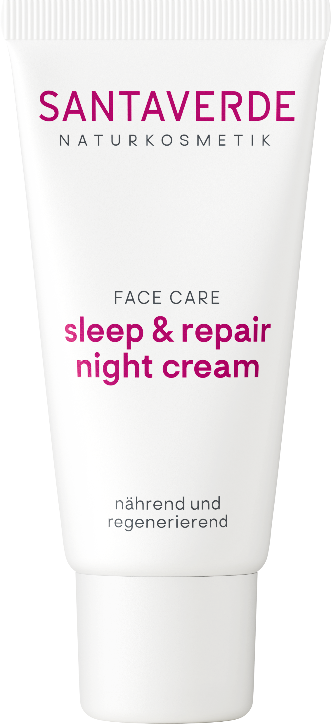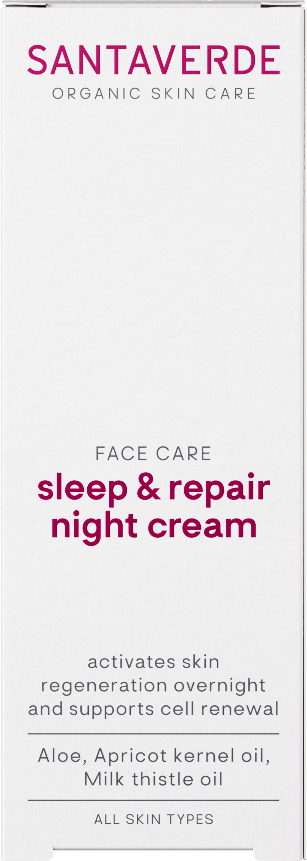 De Sleep & Repair Night Cream van SANTAVERDE is een bijzonder rijke crème en maakt gebruik van mariadistelolie en druivenpitolie om de stress van de dag van de huid te laten verdwijnen. De verzorging voedt intensief, versterkt de beschermingsbarrière en bevordert het regeneratieproces gedurende de nacht. Want tijdens de slaap is de huid beter beschermd tegen invloeden van buitenaf en vernieuwen de cellen zich wel 30 keer sneller dan overdag.