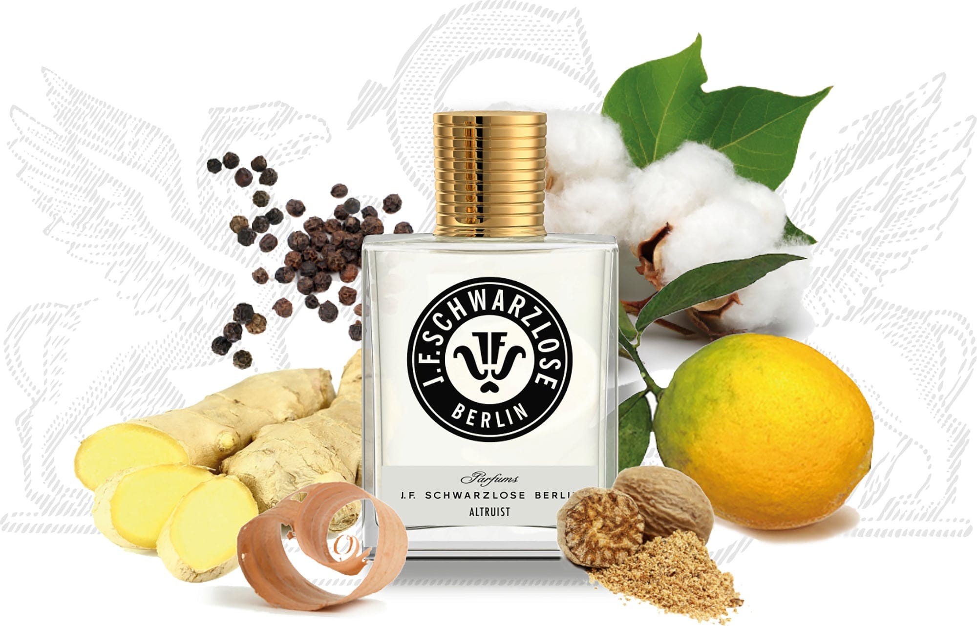 Een citrusachtig Eau de Parfum met duidelijke accenten en een houtachtige basis. Altruist van J.F. Schwarzlose Berlin begint met een frisse introductie. Een vleugje pittige gember geeft het geheel een kruidige nuance. In de hartnoot zorgen roos en oranjebloesem voor een elegante toets en geven de frisheid een zekere sensualiteit. Cederhout, amber en patchouli creëren een warme, kruidige basis.