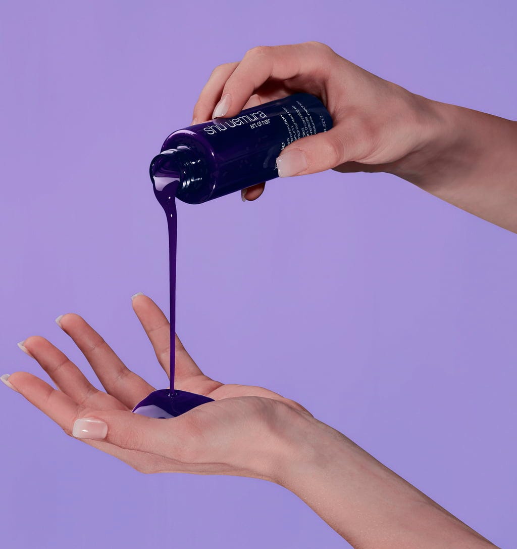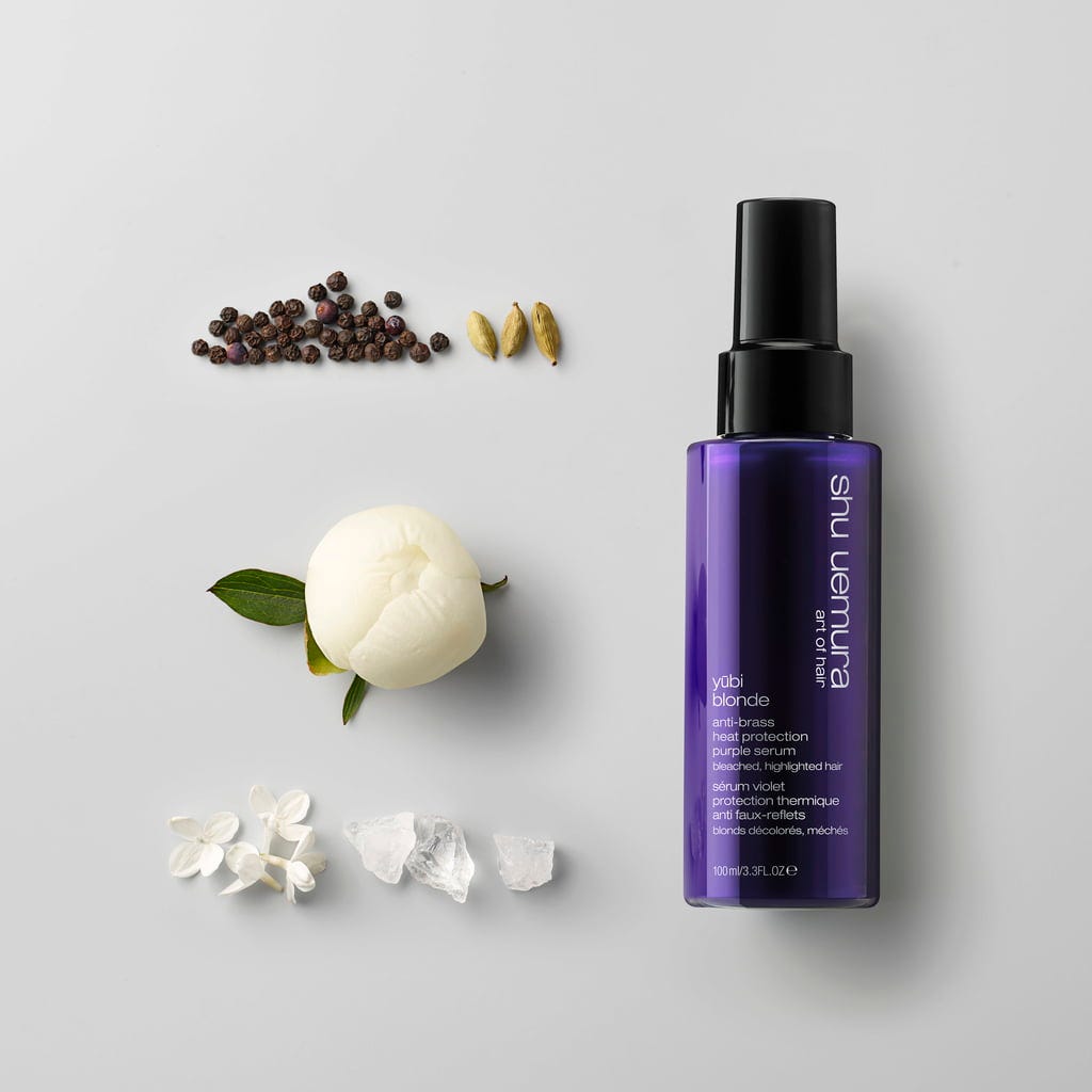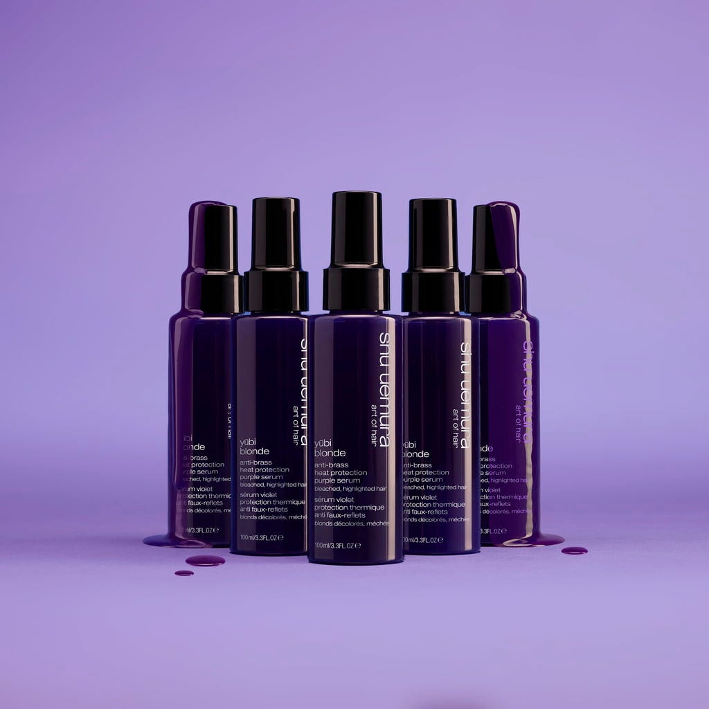 Het Yubi Blonde Anti Brass Purple Serum van shu uemura heeft neutraliserende eigenschappen die gele en oranje ondertonen in blond haar tegengaan.