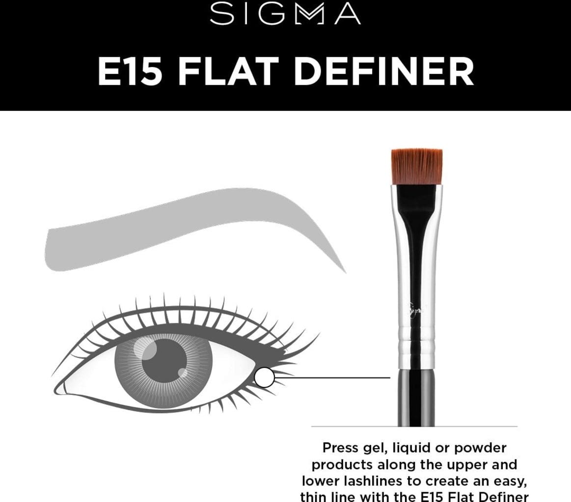 De E15 - Flat Definer Brush van Sigma maakt mogelijk wat velen voor onmogelijk houden: een perfecte, dunne, precieze eyeliner trekken. De speciaal gevormde borstelharen van het penseel zijn zo afgestemd dat schoon werken bij de wimperrand gegarandeerd is. De randen zijn dun, scherp en vlak: ideaal voor een perfecte eyeliner.
