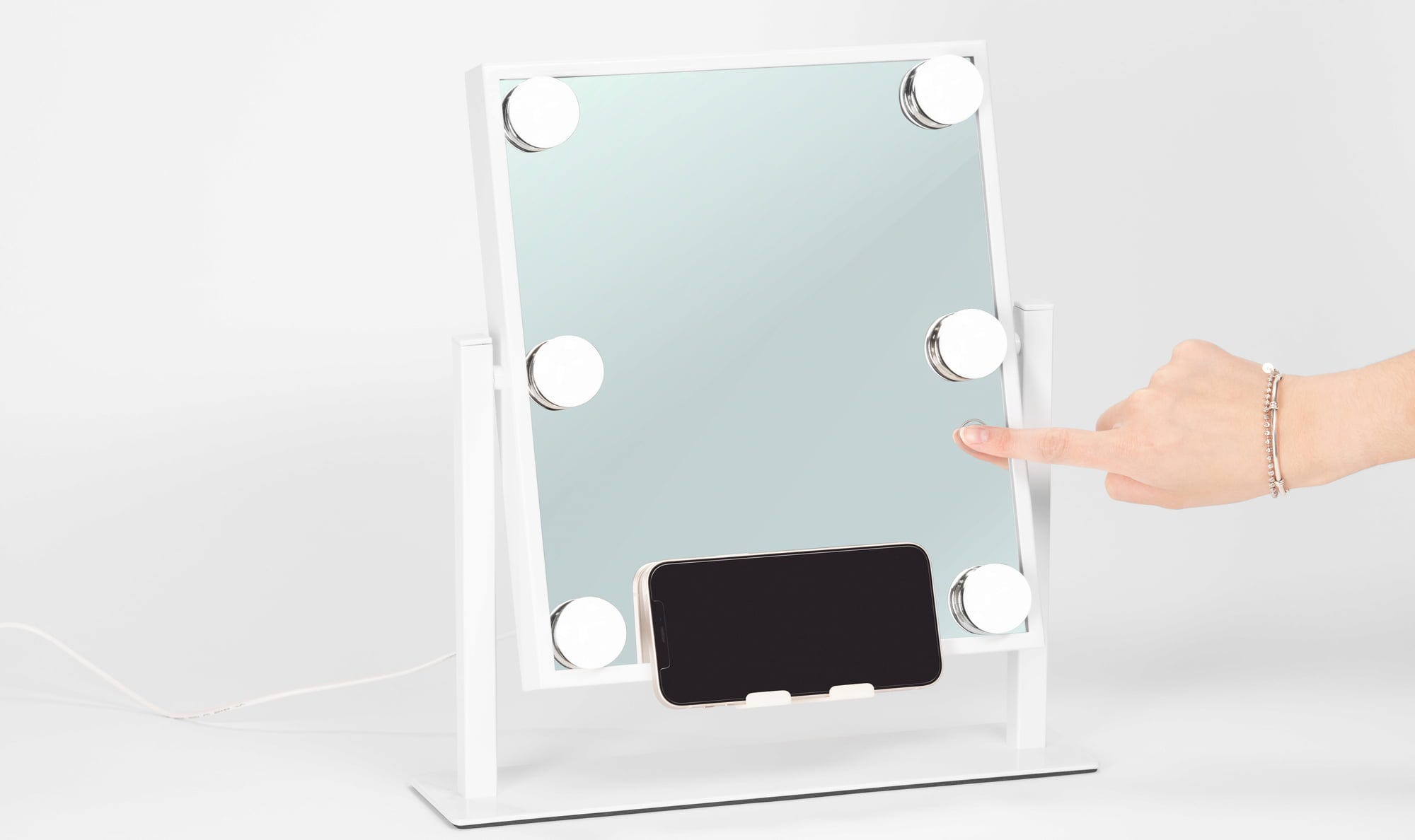 Met de stabiele, antislipstandaard kun je je Glam & Groove Mirror in je slaapkamer of badkamer plaatsen. Het 360° draaibare ontwerp biedt luxe verlichting vanuit elke hoek. Breng een vleugje filmsterglamour uit Los Angeles direct naar jouw huis. Op reis heb je alleen een stroombron nodig om van alle indrukwekkende functies van deze stijlvolle spiegel te genieten.