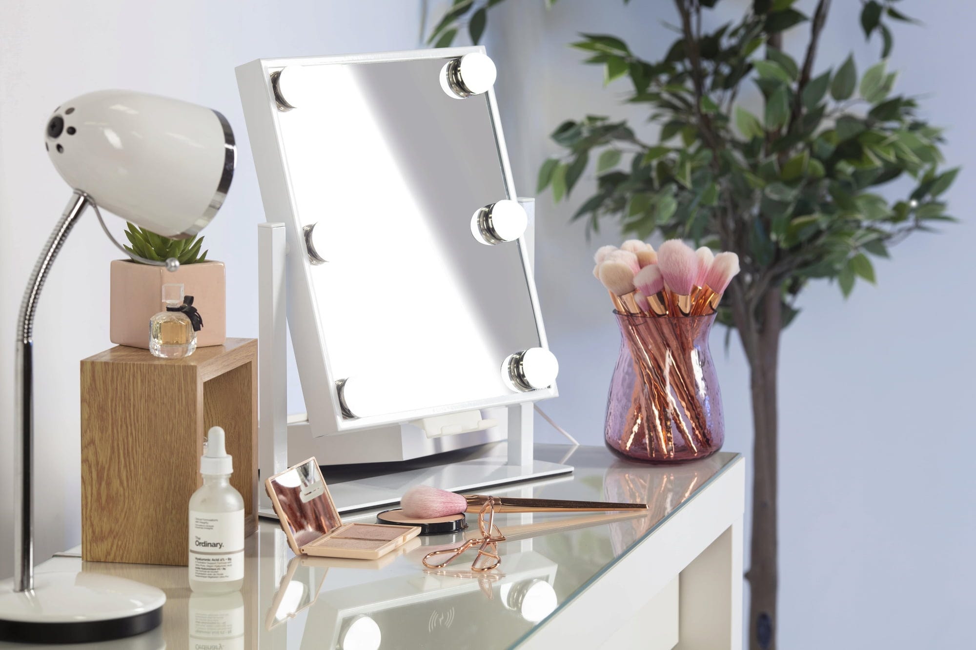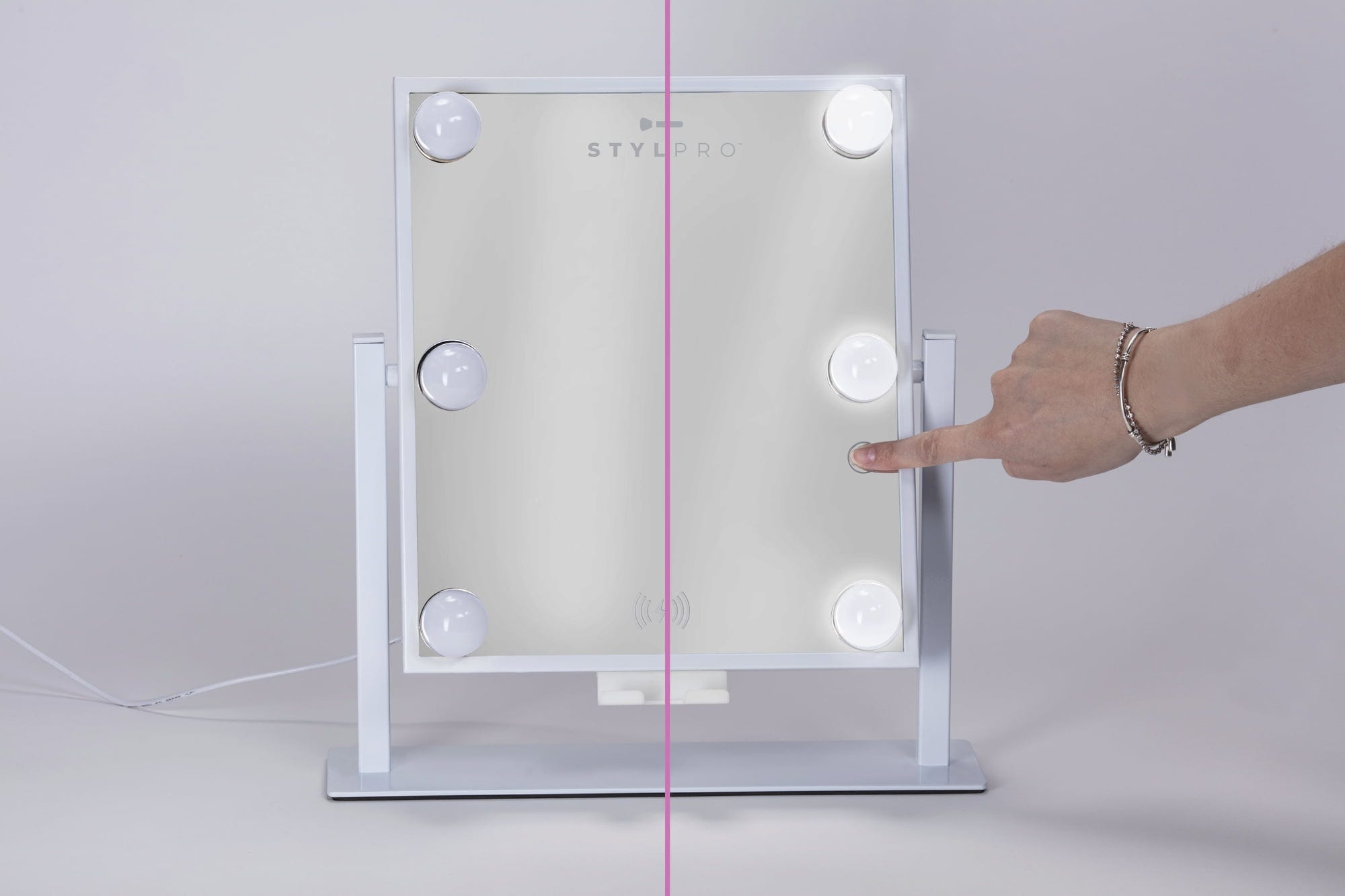 De Glam & Groove Hollywood Vanity Music Mirror van StylPro zorgt voor de ultieme make-up ervaring. Hij ondersteunt je bij je dagelijkse make-uproutine of wanneer je 's avonds een glamoureuze look wilt creëren. Dankzij de ingebouwde dimbare LED-verlichting met zacht wit licht, kun je met één druk op de knop eenvoudig de gewenste verlichtingssterkte instellen, die bovendien de laatste instellingen onthoudt. Dankzij de ingebouwde Bluetooth-functionaliteit kun je je telefoon, tablet of computer met de spiegel verbinden en tijdens het opmaken muziek afspelen, naar je favoriete podcast luisteren of bellen met vrienden. Uiteraard kun je het volume direct op het apparaat instellen. De telefoongreep op de spiegel heeft ook een smart-charger functie, die elke draadloos oplaadbare telefoon kan opladen.
