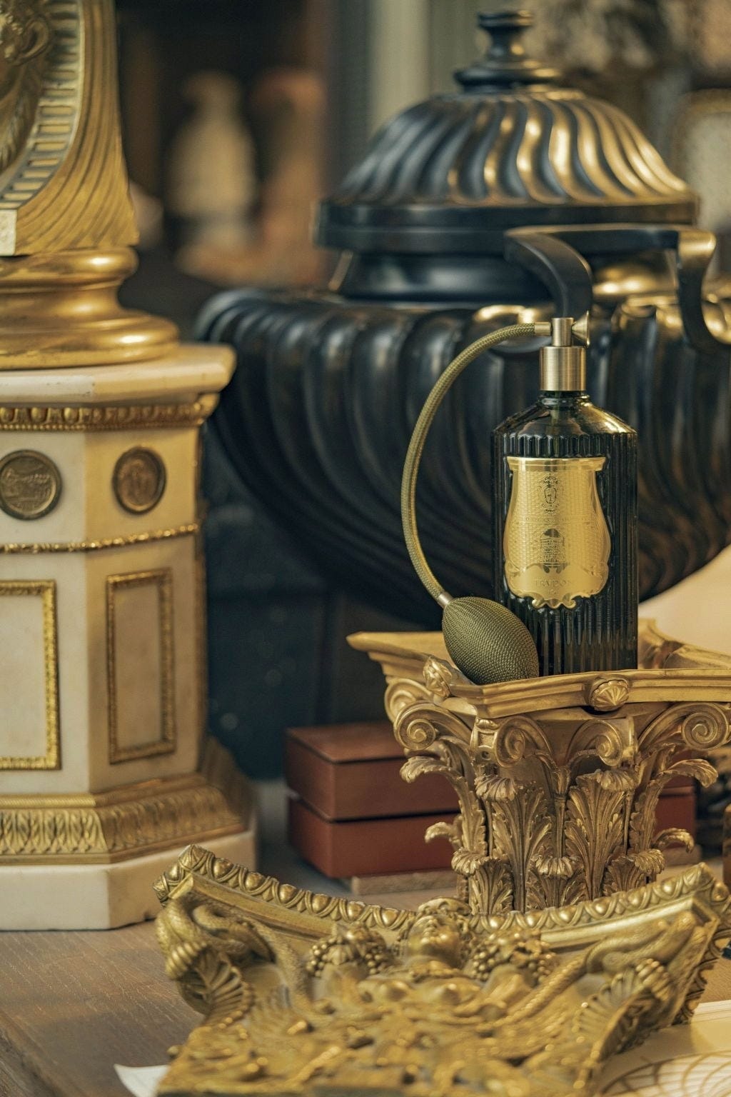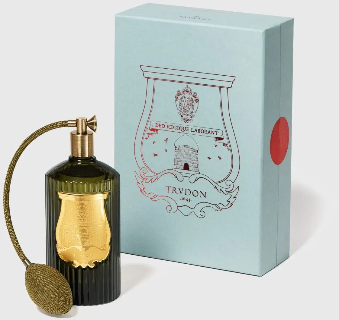 De Room Spray Cyrnos van Trudon is met de hand vervaardigd van iconisch groen glas in Toscane, versierd met een gouden embleem en uitgerust met een traditionele kwast. De spray creëert onmiddellijk een geurige sfeer in je huis en kan niet alleen in de lucht, maar ook op stoffen, gordijnen, tapijten en dekens worden gespoten.