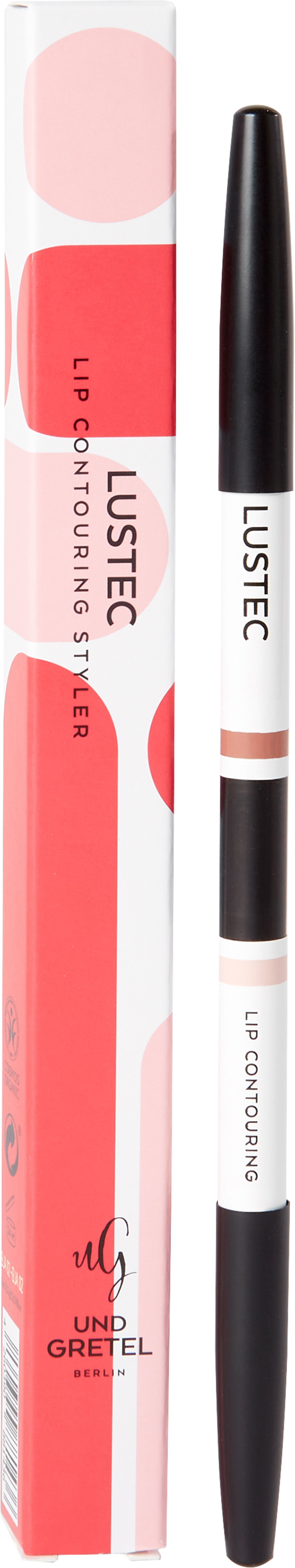 1 potlood, 2 functies - de LUSTEC Correcting Lipliner van UND GRETEL heeft één doel met zijn beide uiteinden: Prachtig gevormde lippen! Het transparante uiteinde werkt als een voorbereidend basis, oftewel primer. Het dient als optische rimpelvervager en vormt een barrière om lekkage van lippenstift te voorkomen. Het gekleurde einde geeft kleur en ondersteunt een glamoureuze finish na bijvoorbeeld het aanbrengen van lipgloss. De hooggepigmenteerde tinten kunnen als contouren voor een lichte make-up worden gebruikt. Wil je je lippen intenser en spannender accentueren, breng dan een bijpassende lippenstift of lipgloss aan.