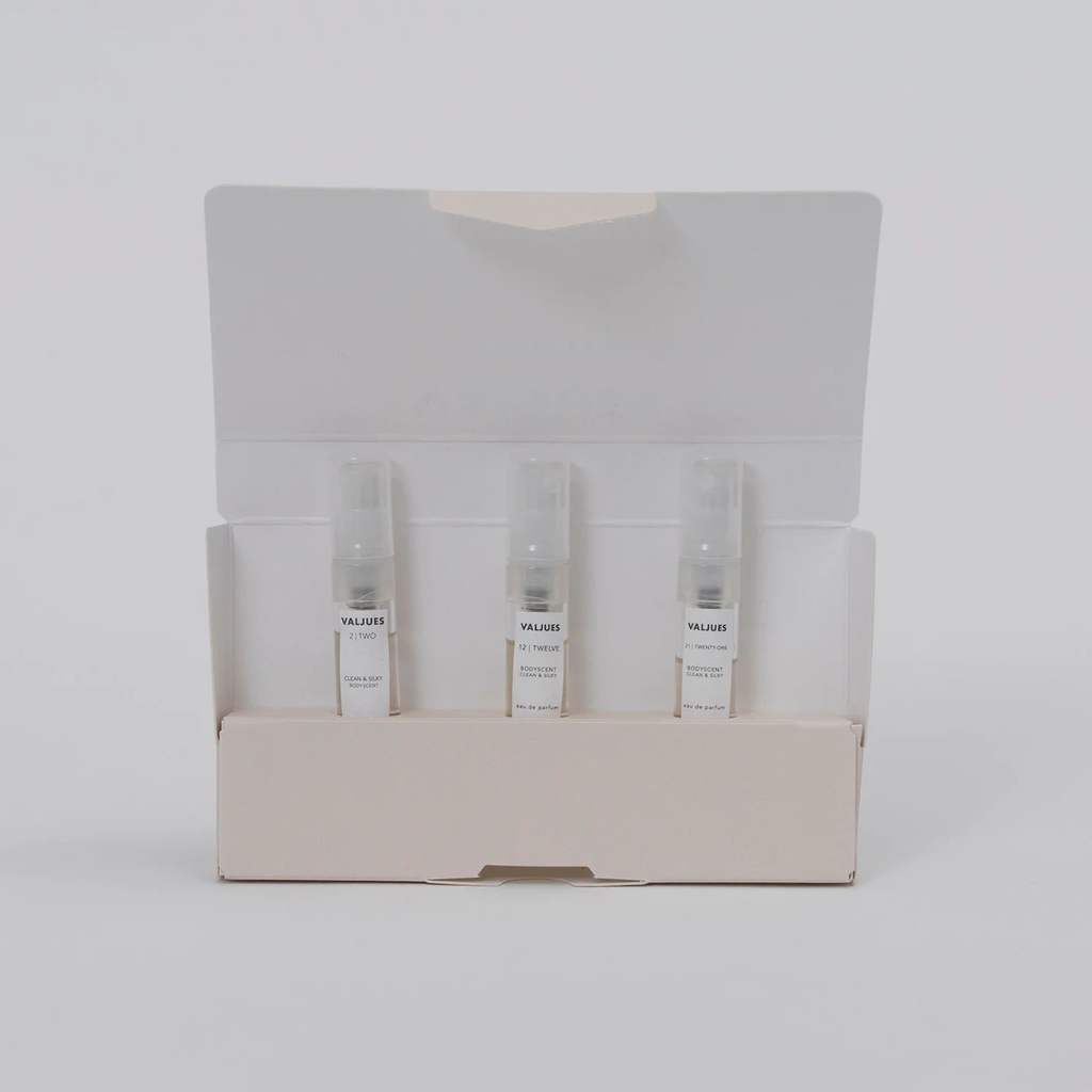 Deze proefset bevat alle drie de CLEAN & SILKY BODYSCENTS: 2 | TWO, 12 | TWELVE en 21 | TWENTY-ONE.
