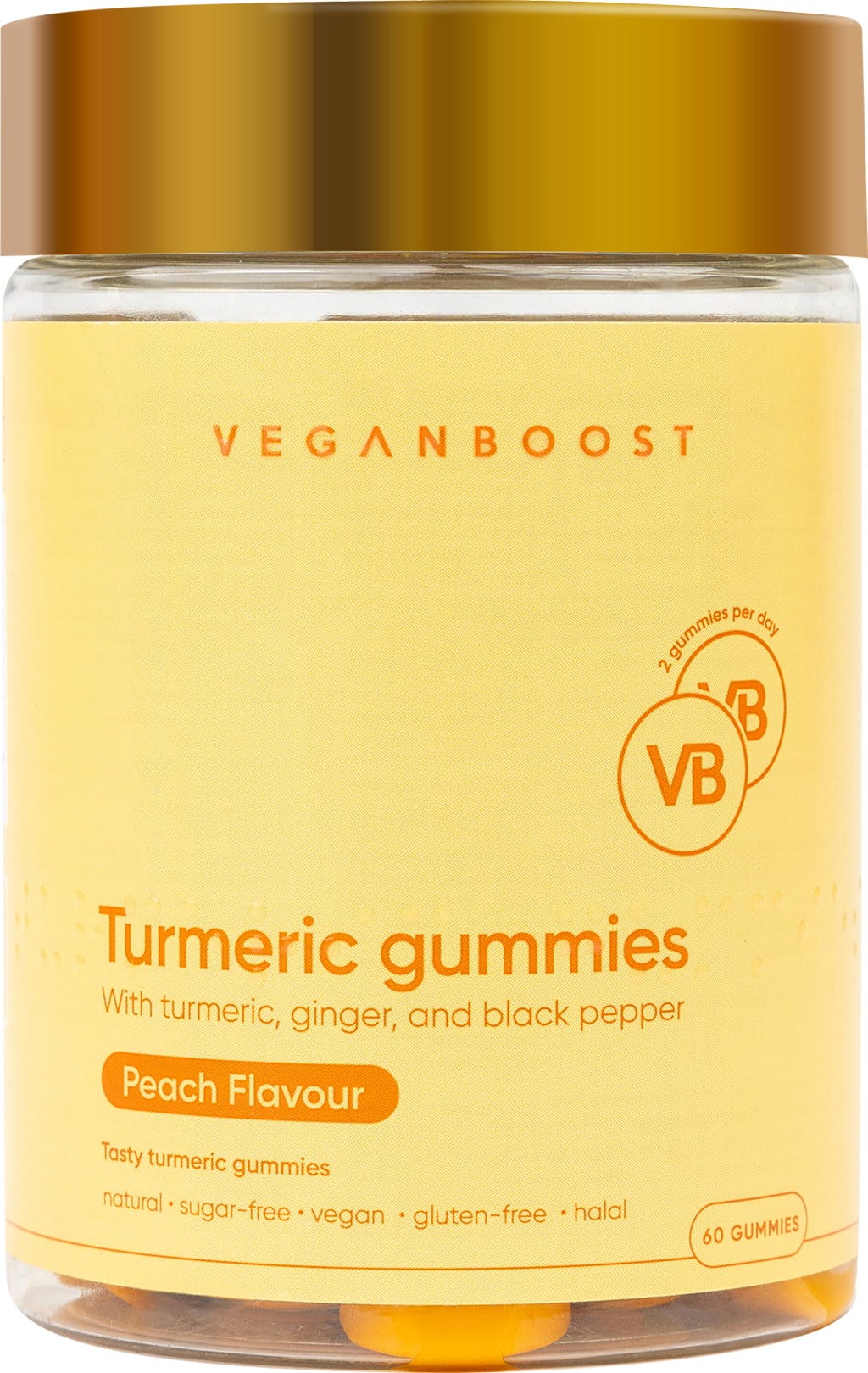 De Turmeric Gummies van Veganboost zijn verrijkt met kurkuma, gember en zwarte peper en zijn 100% vegan. Ze hebben een aangenaam fruitige smaak van verse perziken en bevatten geen toegevoegde suiker.